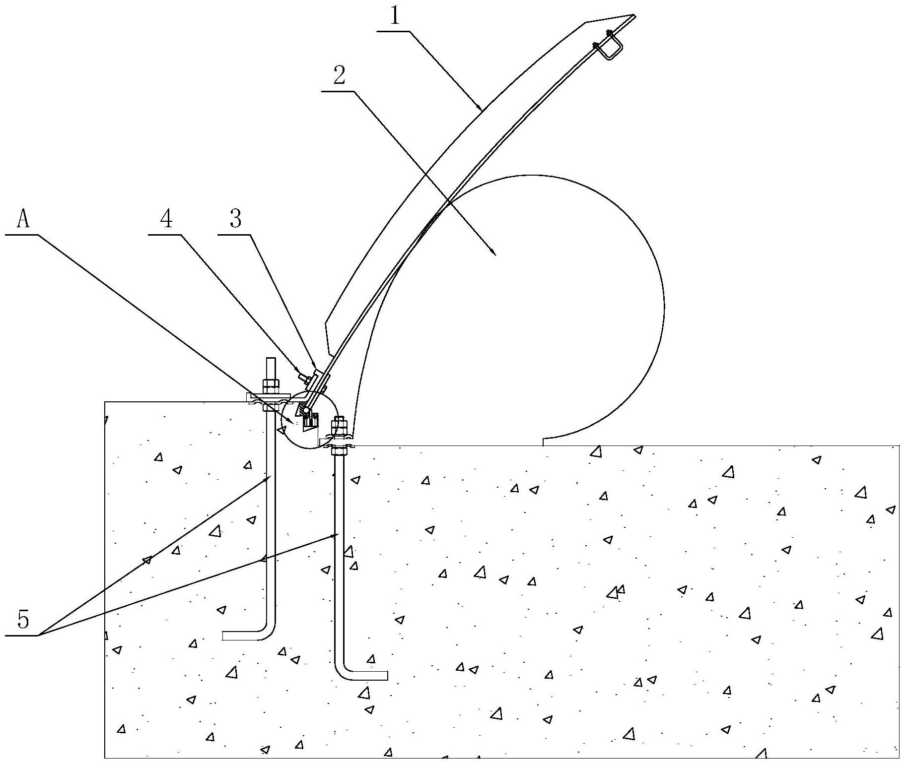 本实用新型属于气盾坝,特别是指一种自限位气盾坝。包括盾板,通过锚固组件、螺栓装配连接于盾板底端与坝基之间的铰链盖板,设置于盾板内侧且通过充排气控制盾板转动的气囊;坝基上固定有转动底座,转动底座端面呈用于控制盾板转动角度的L形结构,转动底座内侧与盾板底端贴合,盾板底端内侧的坝基上固定有自限位装置,自限位装置的限位杆顶端弹性顶压于盾板底端内侧表面。本实用新型有效解决了现有技术存在的安装以及运维难度高、零部件易损坏等问题,具有结构简单、安装方便且施工及运维成本低、零部件配合可靠性好且工作状态稳定等优点。