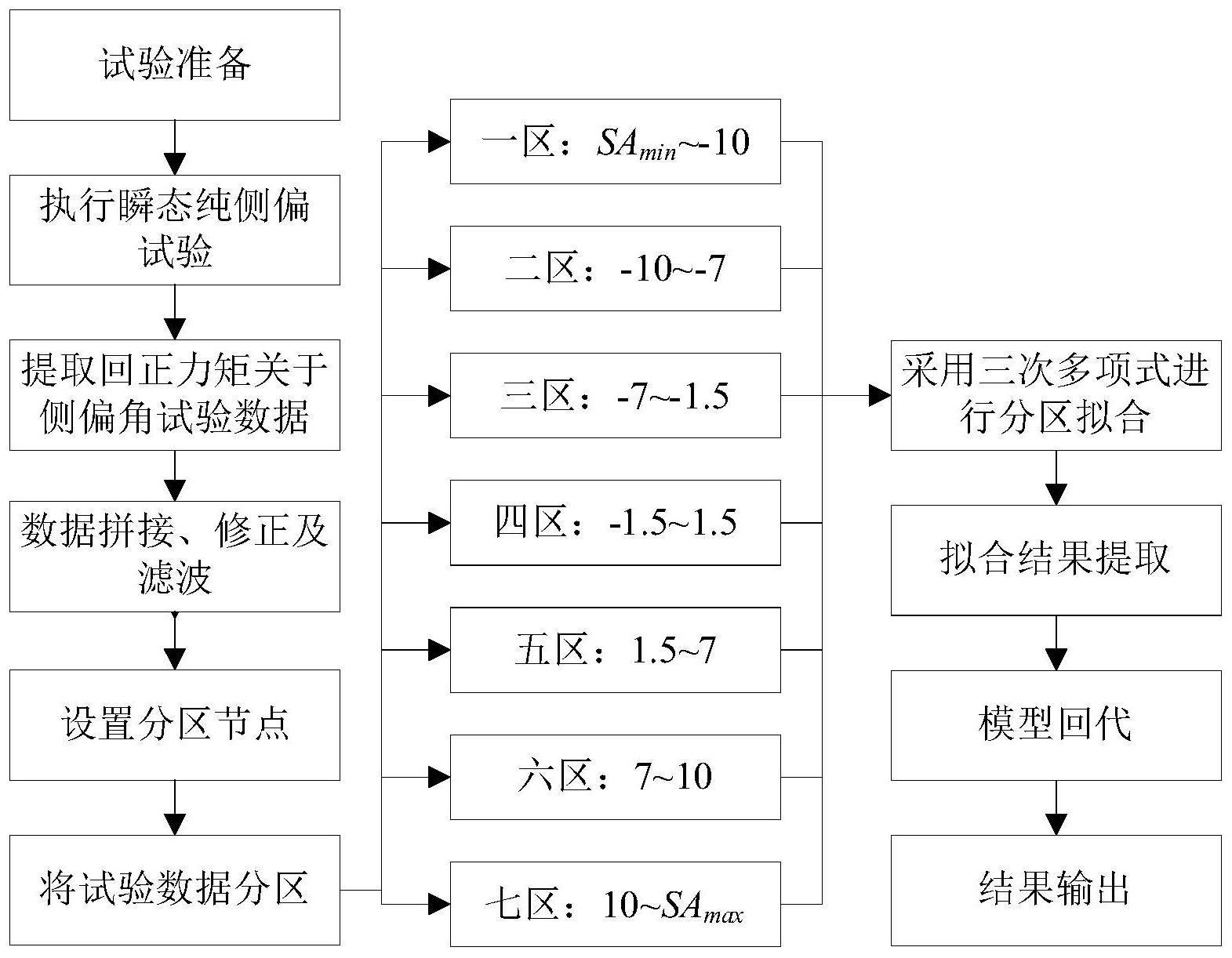 本发明属于轿车轮胎力学特性数据处理领域,具体涉及一种针对瞬态纯侧偏工况下的回正力矩关于侧偏角试验数据进行分区拟合的方法、智能设备和计算机可读载体介质。本发明将侧偏角测量范围分为七个区域,对每个区间的回正力矩关于侧偏角的试验数据进行三次多项式拟合,且约束每个节点处的函数值和一阶导数值相等。通过分区拟合,可将加载段和卸载段的试验数据进行高精度拟合成光滑的曲线,用以计算轮胎特征值、对标分析或用于轮胎模型辨识。具有准确性高、重复性好、效率高的特点。
