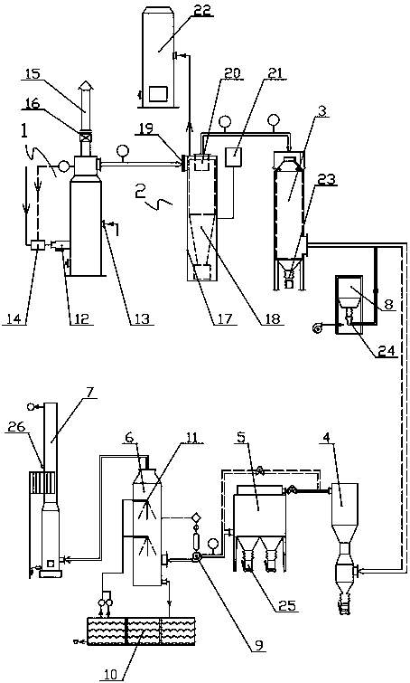 本实用新型涉及一种活性炭再生窑炉尾气无害化处理系统,包括依次连接的二燃室、余热锅炉、急冷中和塔、干燥塔、布袋除尘器、碱液喷淋塔和和烟囱,二燃室本体上设置有燃烧器和二次补氧进气口,燃烧器的进气口上设置有控制阀组,以便接入窑炉尾气,二燃室本体顶部设置有紧急排放烟囱,紧急排放烟囱上设置有气动阀门。急冷中和塔与干燥塔之间的连接管路上旁接有干式喷射装置,干式喷射装置内装有活性炭颗粒,以便吸收二噁英气体。布袋除尘器与碱液喷淋塔的连接管路上设置有引风机。本实用新型的活性炭再生窑炉尾气无害化处理系统设计合理,能够很好地处理活性炭再生窑炉生成的尾气,通过多道工序的净化处理后,使之对大气无损害,符合环保排放标准。