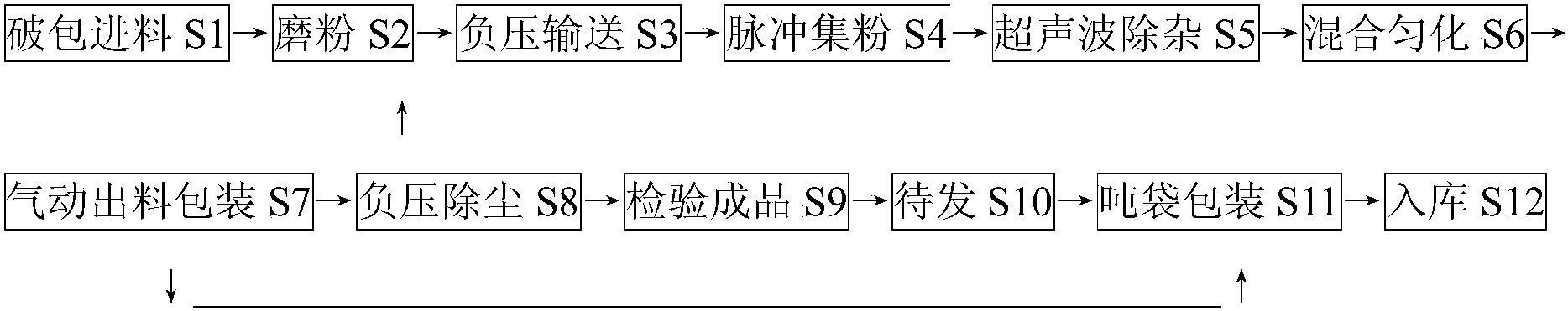 一种活性炭生产系统以及生产工艺,包括:破包进料机(1)、磨粉机、负压输送设备(3)、除尘器(4)、输料螺旋(5)、混合机(6)、风机(7)、车间支柱(8)。破包进料机(1),具有圆形转盘,与进料槽连接,将整包活性炭粒包装袋拆开。磨粉机与破包进料机(1)连接,将活性炭粒粉碎成小颗粒状。负压输送设备(3)一端与磨粉机连接,另一端与除尘器(4)连接,将小颗粒状的炭粒粉输送至除尘器(4)。除尘器(4)设有脉冲集粉装置和超声波除杂装置。混合机(6)混合匀化除尘后的小颗粒状活性炭为活性炭粉;并输送至包装处。风机(7)与混合机(6)连接。通过二次粉碎解决堵塞问题。混合机内设置复数个刀片,提高了混合的效率。