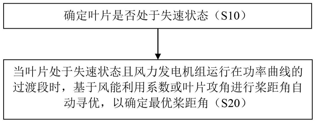 本发明提供了一种叶片失速条件下桨距角自动寻优的方法及设备。所述方法包括:确定叶片是否处于失速状态;当叶片处于失速状态且风力发电机组运行在功率曲线的过渡段时,基于风能利用系数或叶片攻角进行桨距角自动寻优,以确定最优桨距角。根据所述方法及设备,能够确定叶片失速条件下的最优桨距角,以使叶片脱离失速区,并尽可能降低发电量损失。