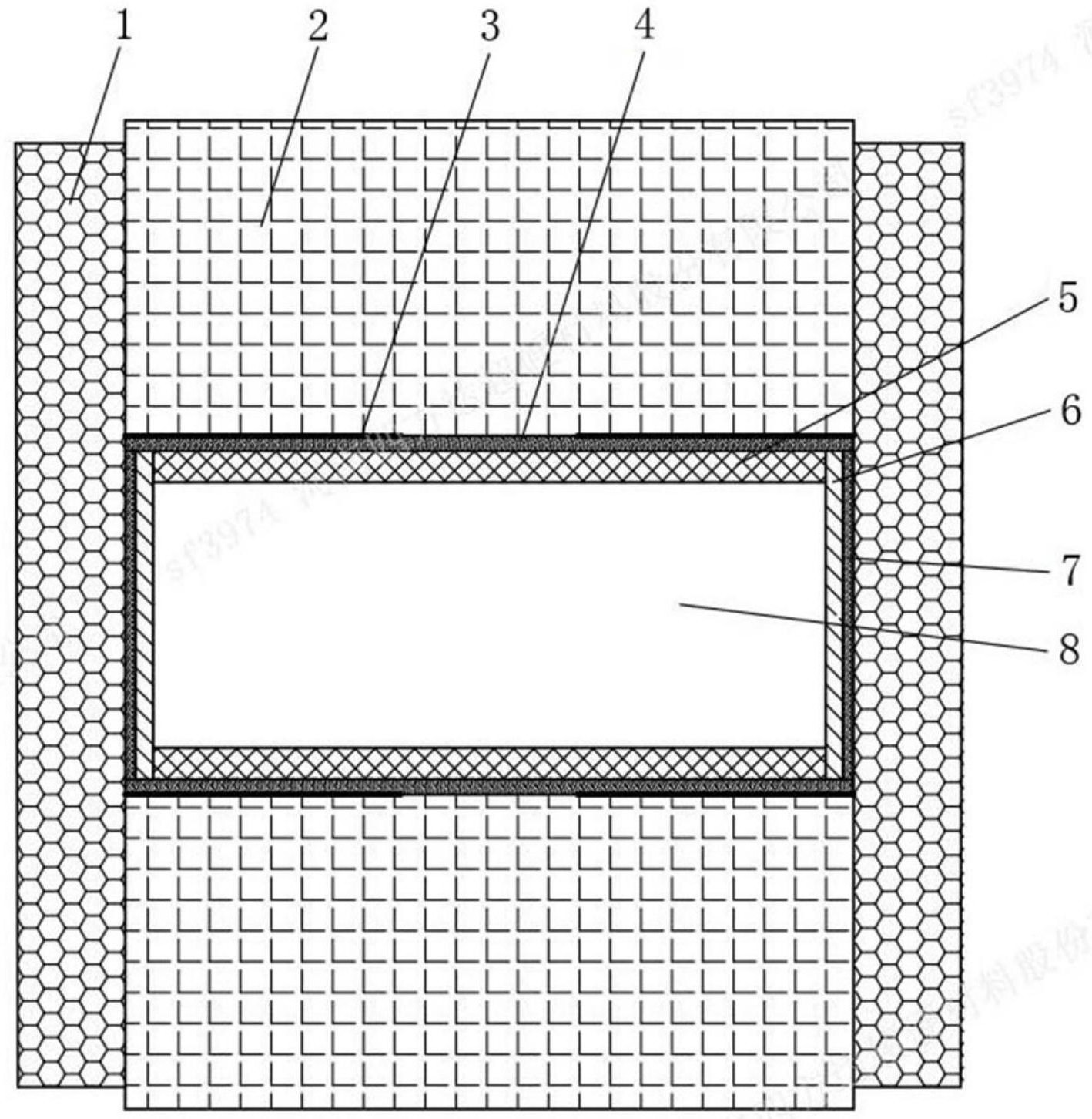 本实用新型涉及聚晶金刚石复合片合成技术领域,尤其涉及一种聚晶金刚石复合片的烧结模具。聚晶金刚石复合片的烧结模具包括合成块,合成块上设有通孔结构,通孔的内周壁上贴合设有发热管,发热管的内周壁上贴合设有绝缘管,绝缘管的两端面上贴合设有绝缘片,绝缘管以及两端的绝缘片共同围成合成腔室,两端的绝缘片的背向合成腔室的一侧依次贴合设有发热片、保温环片以及传压导流组件,发热片与发热管电连接,保温环片上设有开孔结构,使用时传压导流组件与发热片在保温环片的开孔处受压变形接触形成电连接。该烧结模具能够延缓腔室两端的散热速率,有效提升合成腔室内部温度场的均匀性,可以根据实际温度需求调整开孔大小。