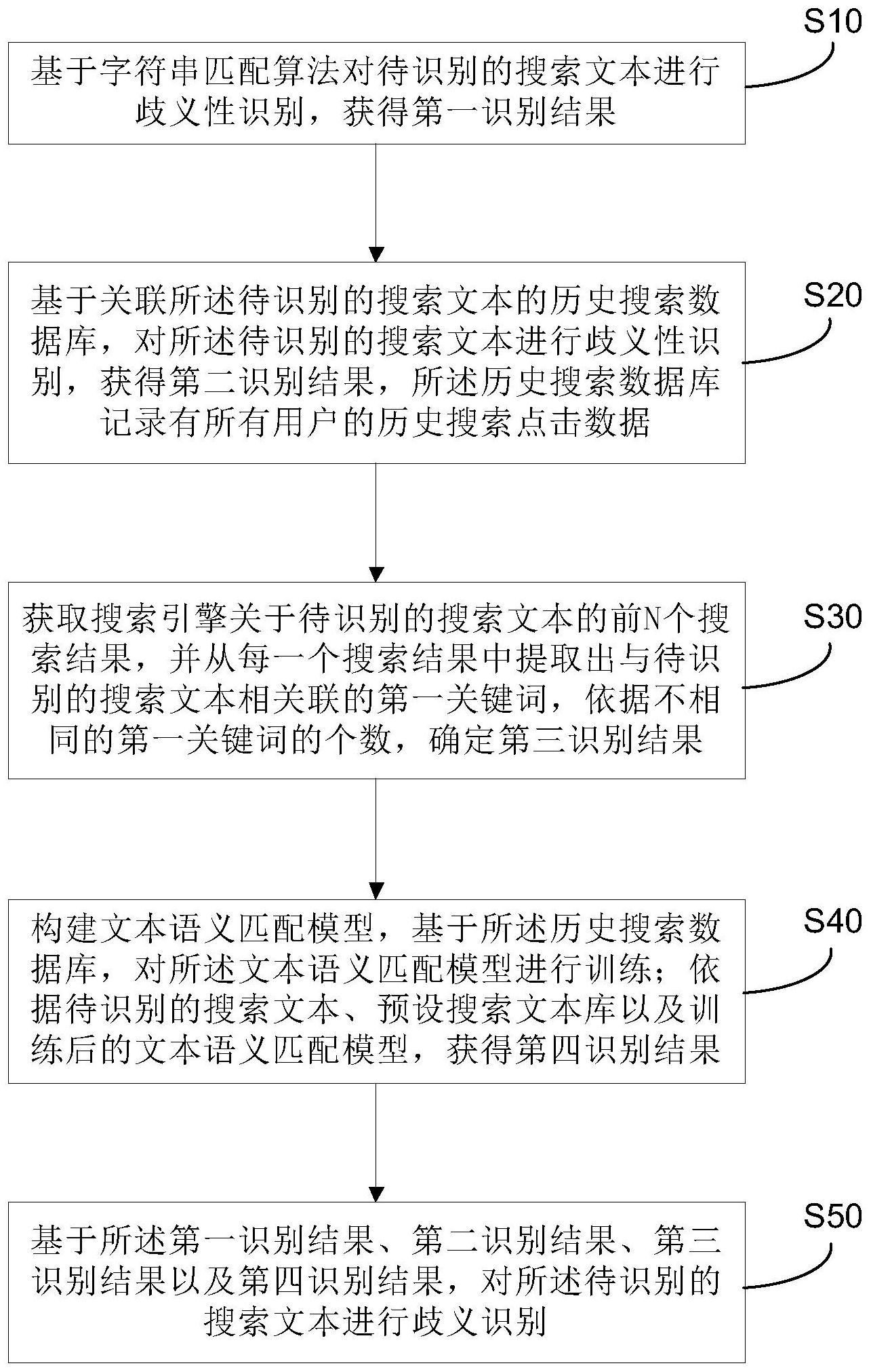 本发明提供了一种搜索文本的歧义识别方法、系统、设备及存储介质,所述方法包括步骤:基于字符串匹配算法对待识别的搜索文本进行歧义性识别,获得第一识别结果;基于关联待识别的搜索文本的历史搜索数据库,对待识别的搜索文本进行歧义性识别,获得第二识别结果;获取搜索引擎关于待识别的搜索文本的前N个搜索结果,并从每一个搜索结果中提取出第一关键词,依据不相同的第一关键词的个数,确定第三识别结果;构建文本语义匹配模型,依据训练后的文本语义匹配模型,获得第四识别结果;基于上述识别结果,对待识别的搜索文本进行歧义识别;本申请实现了对搜索文本歧义性的多角度识别,提高了识别的准确性。