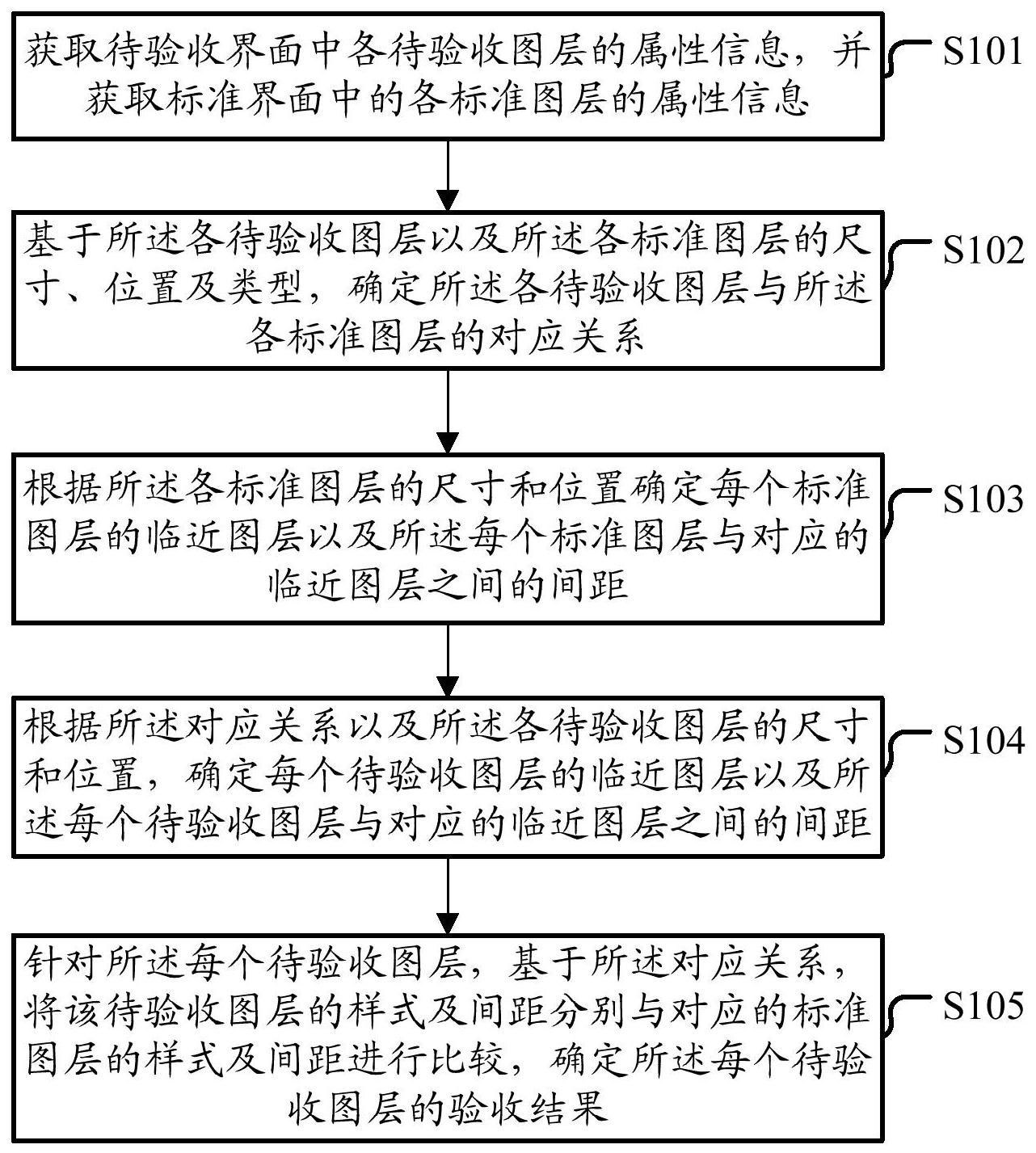 本发明实施例提供了一种应用程序界面的验收方法、装置及电子设备,方法包括:获取待验收界面中各待验收图层的属性信息,获取标准界面中的各标准图层的属性信息;基于各待验收图层以及各标准图层的尺寸、位置及类型,确定各待验收图层与各标准图层的对应关系;根据各标准图层的尺寸和位置确定每个标准图层的临近图层以及间距;根据对应关系,确定每个待验收图层的临近图层以及间距;针对每个待验收图层,基于对应关系,将该待验收图层的样式及间距分别与对应的标准图层的样式及间距进行比较,确定每个待验收图层的验收结果。无需人工测量待验收界面和标准界面中各个图层的样式和间距进行比较,可以提高应用程序界面的验收效率。