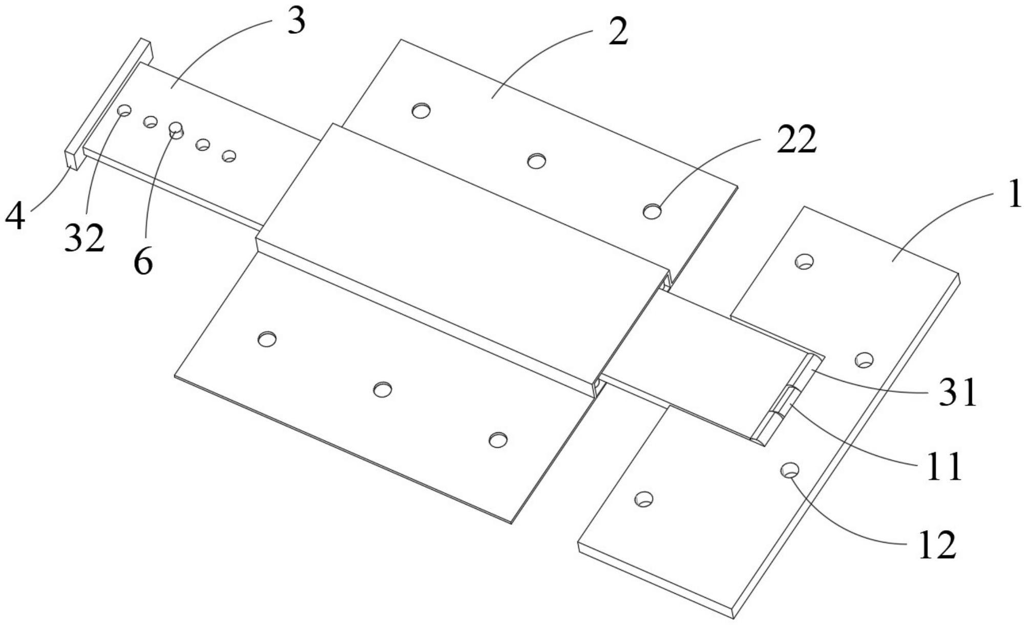 本实用新型属于合页装置技术领域,具体涉及一种暗门用可抽拉合页装置及暗门装配系统,本暗门用可抽拉合页装置包括:第一固定页片、第二固定页片和拉伸调节块;第一固定页片固定于第一固定面,第二固定页片固定于第二固定面,拉伸调节块穿过第二固定页片,拉伸调节块的一端与第一固定页片铰接;本实用新型通过第一固定页片固定门扇、第二固定页片固定墙面,通过拉伸调节块实现门扇既能相对墙面转动又能相对墙面移动,满足医院走廊暗门可抽拉合页的需求,有效打破传统合页的局限性,无需进行现场动火焊接作业,可在门扇上设置贯通式扶手,无需断开设计,可以任意调节门扇的开启角度,最高至180度平开,可充分满足消防验收的需求。