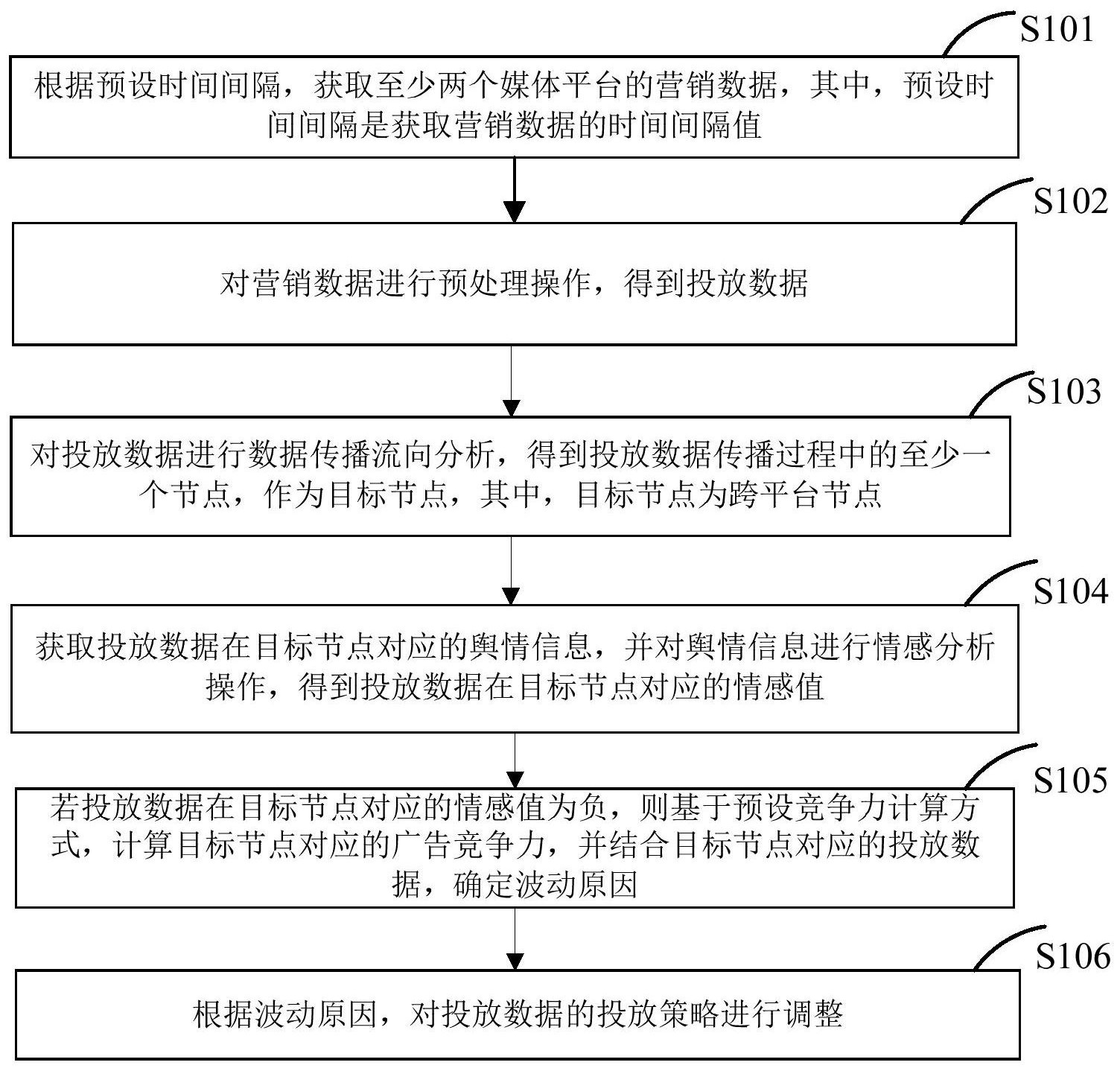 本发明公开了一种广告投放调整方法,用于提高广告投放的回报率。本发明提供的方法包括:根据预设时间间隔,获取至少两个媒体平台的营销数据,对营销数据进行预处理操作,得到投放数据。对投放数据进行数据传播流向分析,得到所述投放数据传播过程中的至少一个节点,作为目标节点。获取所述投放数据在所述目标节点对应的舆情信息,并对所述舆情信息进行情感分析操作,得到所述投放数据在所述目标节点对应的情感值,若所述投放数据在所述目标节点对应的情感值为负,则基于预设竞争力计算方式,计算所述目标节点对应的广告竞争力,并结合所述目标节点对应的投放数据,确定波动原因,根据所述波动原因,对所述投放数据的投放策略进行调整。