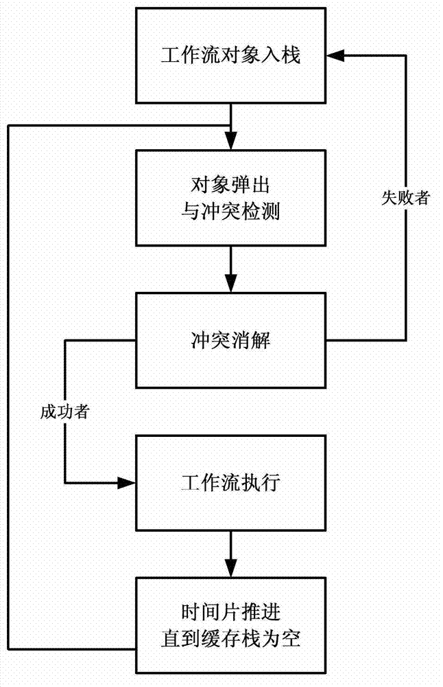 本发明公开了一种工作流执行中的资源冲突消解方法,用一个六元组表示对象P,即有P=(i,j,D,A,t,L);资源冲突消解进程如下:步骤1:工作流对象进入堆栈;步骤2:工作流对象从堆栈弹出,并进行冲突检测:当下述公式满足时,判断对象的实施为有冲突实施:((A<sub>g,i</sub>∩A<sub>h,j</sub>∩…∩A<sub>k,l</sub>)≠φ)∧((L<sub>g,i</sub>∨…∨L<sub>h,j</sub>)=0)∧((L<sub>i,k</sub>∧…∧L<sub>k,l</sub>)=1);步骤3:消解冲突步骤:当两对象的实施为有冲突实施时,优先级高的对象获得即时实施,并锁定相应空域;而优先级低的对象被压入堆栈,返回步骤2;随着时间片推进,当堆栈为空时,结束工作流执行中的资源冲突消解进程。该工作流执行中的资源冲突消解方法适用范围广,能有效减轻工作量中的资源冲突。