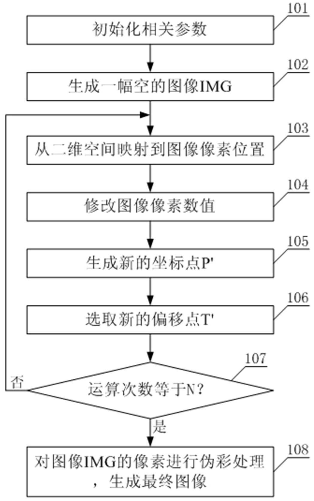 一种九芒星分形图像生成方法,包括以下步骤:生成正九边形,并进行初始化;生成空白图像;从二维空间映射到图像像素位置;修改图像像素数值;生成新的坐标点;选取新的偏移点;生成所述九芒星分形图像。本发明的九芒星分形图像生成方法,能够提高运算速度,以提高图像生成速度并且获得更加奇妙的艺术效果。