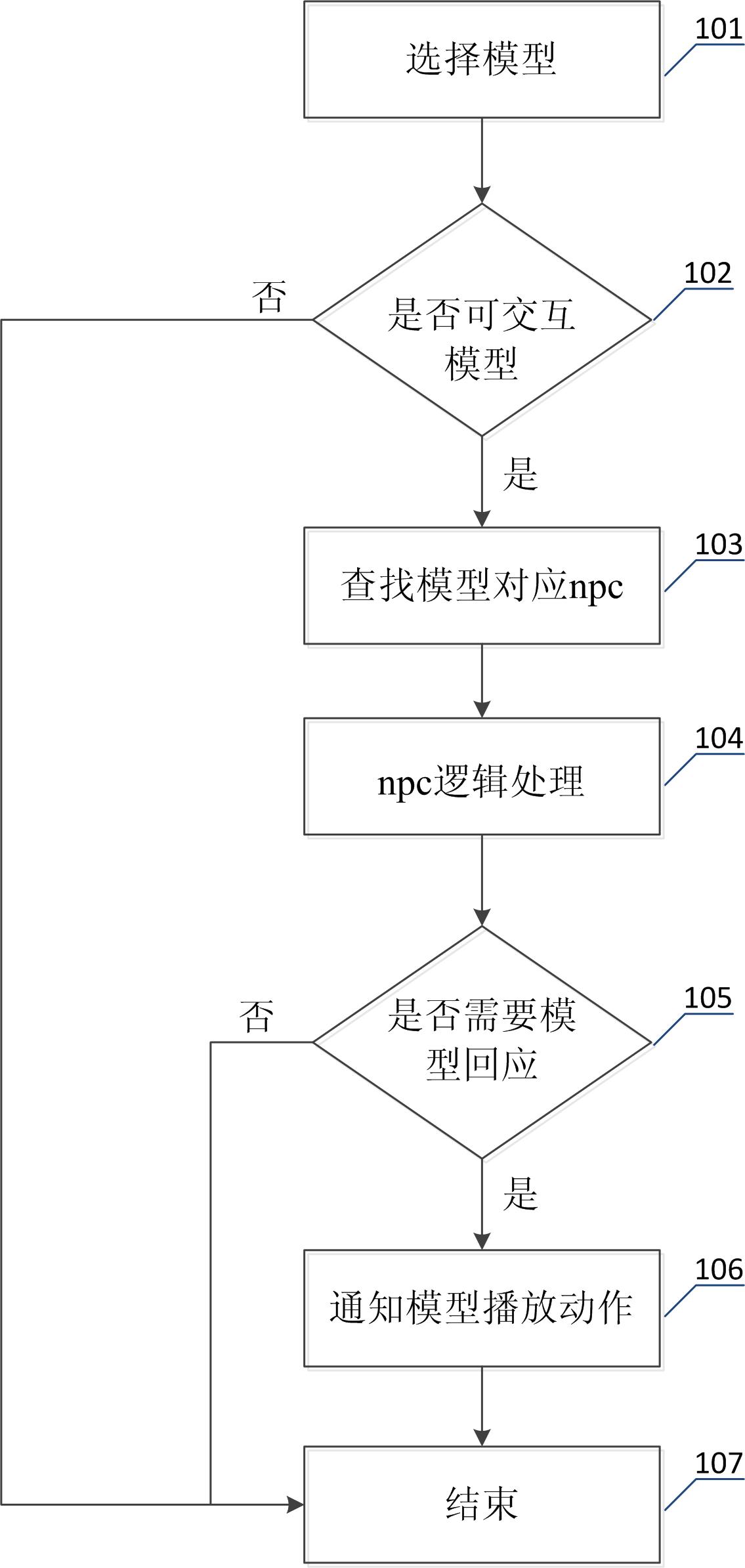 一种模型交互实现方法,包括:1)选择模型,读取配置文件并确认可交互模型;2)查找所述可交互模型ID对应的配置信息,并创建对应的逻辑角色;3)在所述逻辑角色上设置所述可交互模型的ID和逻辑属性;4)通知所述可交互模型回应,所述可交互模型播放动作。本发明的模型交互实现方法将数据可修改地形的需要交互的模型直接与逻辑角色进行了关联,具有了逻辑功能,而不需要再额外创建新的模型资源,使玩家与地形模型的交互更加方便。
