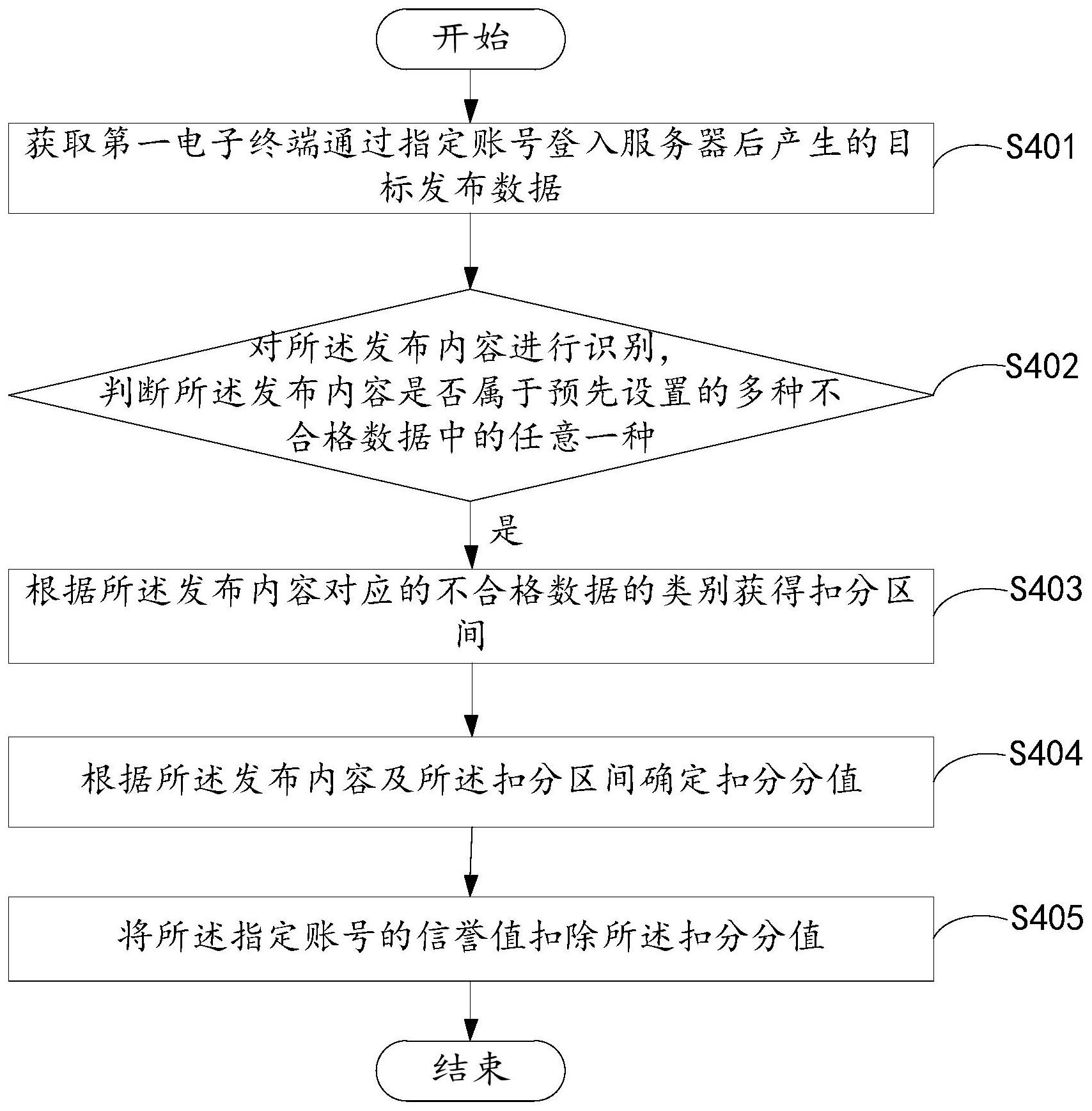 本发明实施例提供一种用户账号管理方法及装置。其中,所述用户账号管理方法应用于服务器,该服务器与第一电子终端通信连接,所述第一电子终端可通过指定账号登入所述服务器,所述用户账号管理方法包括:获取第一电子终端通过所述指定账号登入所述服务器后产生的目标发布数据,所述目标发布数据包括发布内容;对所述发布内容进行识别,判断所述发布内容是否属于预先设置的多种不合格数据中的任意一种;若是,则根据所述发布内容对应的不合格数据的类别获得扣分区间;以及根据所述发布内容及所述扣分区间确定扣分分值;将所述指定账号的信誉值扣除所述扣分分值。