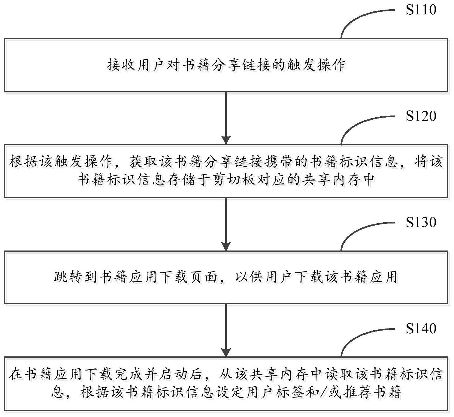 本发明公开了一种基于剪切板信息共享实现的推荐方法以及终端,该方法包括:接收用户对书籍分享链接对应的分享页面的触发操作;根据该触发操作,获取该书籍分享链接携带的书籍标识信息,将该书籍标识信息存储于剪切板对应的共享内存中;跳转到书籍应用下载页面,以供用户下载该书籍应用;在书籍应用下载完成并启动后,从该共享内存中读取该书籍标识信息,根据该书籍标识信息设定用户标签和/或推荐书籍。利用本发明方案,可以依据用户对分享页面的操作存储书籍标识信息,并用于书籍应用首次启动时的用户标签设定和书籍推荐。