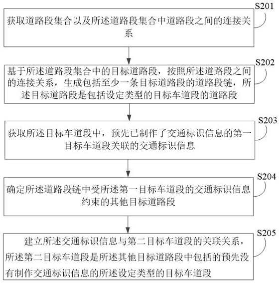 本公开实施例公开了一种关联交通标识信息的方法、装置及电子设备,所述方法包括:获取道路段集合以及道路段集合中道路段之间的连接关系;基于道路段集合中的目标道路段,按照道路段之间的连接关系,生成道路段链;获取目标车道段中,预先已制作了交通标识信息的第一目标车道段关联的交通标识信息;基于第一目标车道段所在的目标道路段在道路段链中的位置,确定道路段链中受交通标识信息约束的其他目标道路段;建立交通标识信息与第二目标车道段的关联关系,第二目标车道段是其他目标道路段中包括的预先没有制作交通标识信息的设定类型的目标车道段。该技术方案能够避免已有的地图数据中遗漏部分目标车道的车道限制信息的情况。