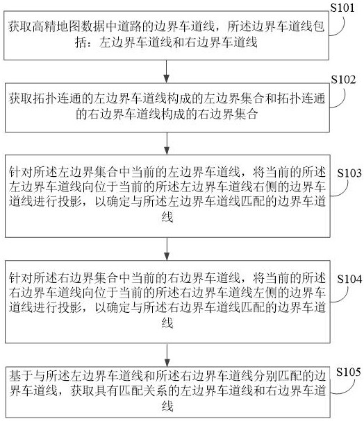 本公开实施例公开了一种边界车道线匹配方法、装置、电子设备及存储介质,所述方法包括:获取高精地图数据中道路的边界车道线;获取拓扑连通的左边界车道线构成的左边界集合和拓扑连通的右边界车道线构成的右边界集合;针对所述左边界集合中当前的左边界车道线,将当前的所述左边界车道线向位于当前的所述左边界车道线右侧的边界车道线进行投影;针对所述右边界集合中当前的右边界车道线,将当前的所述右边界车道线向位于当前的所述右边界车道线左侧的边界车道线进行投影,以确定与所述右边界车道线匹配的边界车道线;基于与所述左边界车道线和所述右边界车道线分别匹配的边界车道线,获取具有匹配关系的左边界车道线和右边界车道线。
