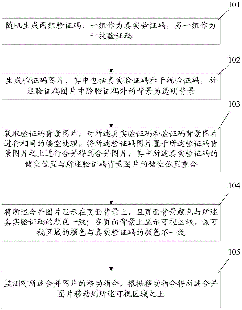 本申请公开了一种验证码处理方法,包括:随机生成两组验证码,一组作为真实验证码,另一组作为干扰验证码;生成验证码图片,其中包括真实验证码和干扰验证码,所述验证码图片中除验证码外的背景为透明背景;获取验证码背景图片,对所述真实验证码和验证码背景图片进行相同的镂空处理,将所述验证码图片置于所述验证码背景图片之上进行合并得到合并图片,其中所述真实验证码的镂空位置与所述验证码背景图片的镂空位置重合;将所述合并图片显示在页面背景上,且页面背景颜色与所述真实验证码的颜色一致;在页面背景上显示可视区域,该可视区域的颜色与真实验证码的颜色不一致;监测对所述合并图片的移动指令,根据移动指令将所述合并图片移动到所述可视区域之上。本发明可以提高机器人程序识别验证码的难度,提高验证码的安全性。