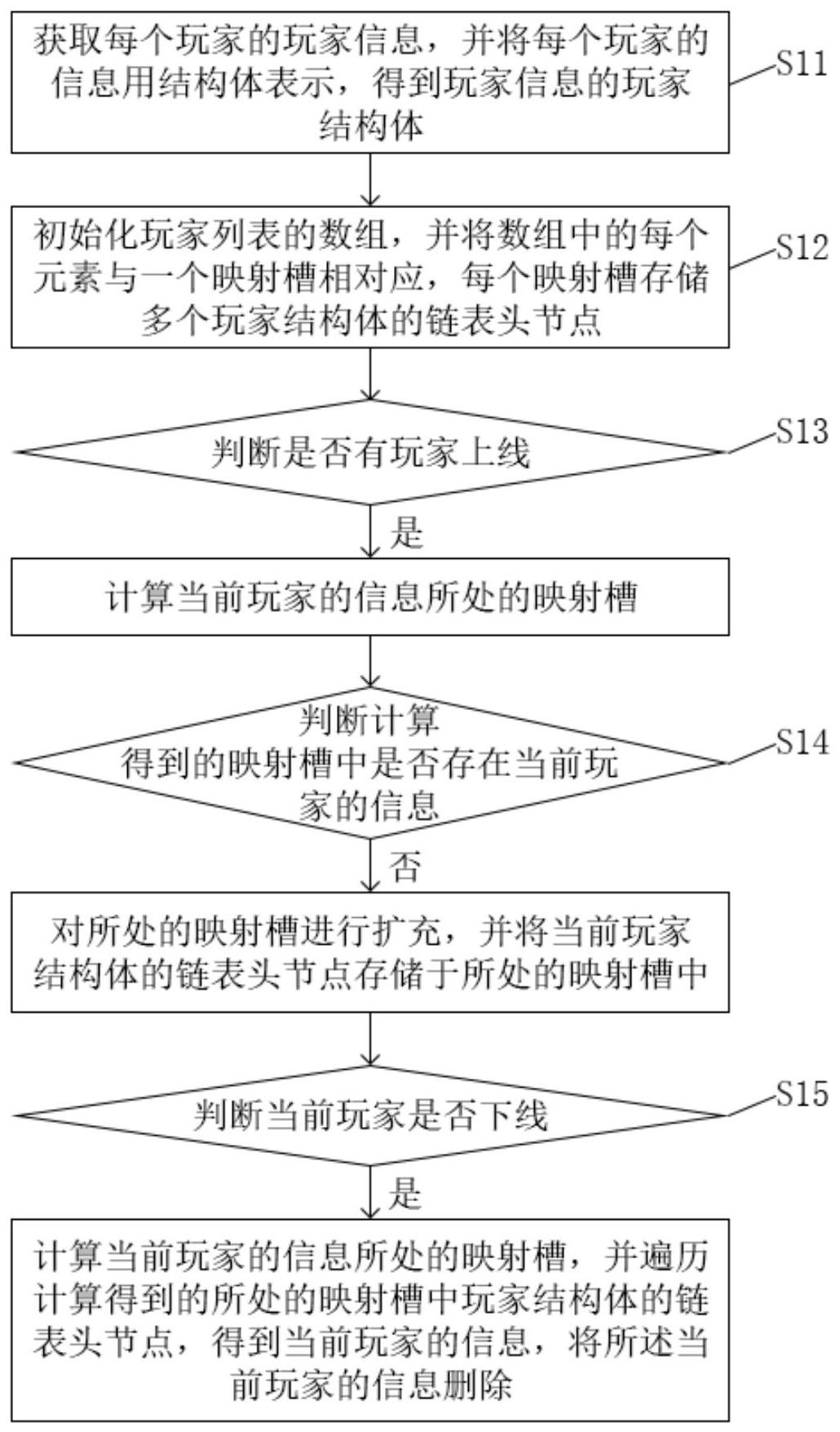 本发明公开了一种玩家列表更新、查询的方法,包括:S1.获取每个玩家的玩家信息,并将每个玩家的信息用结构体表示,得到玩家信息的玩家结构体;S2.初始化玩家列表的数组,并将数组中的每个元素与一个映射槽相对应,每个映射槽存储多个玩家结构体的链表头节点;S3.判断是否有玩家上线,若是,则计算当前玩家的信息所处的映射槽;S4.判断计算得到的映射槽中是否存在当前玩家的信息,若否,则对所处的映射槽进行扩充,并将当前玩家结构体的链表头节点存储于所处的映射槽中;S5.判断当前玩家是否下线,若是,则计算当前玩家的信息所处的映射槽,并遍历计算得到的所处的映射槽中玩家结构体的链表头节点,得到当前玩家的信息,将所述当前玩家的信息删除。