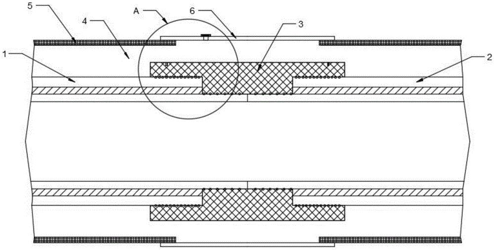 本实用新型涉及管道连接领域,尤其是一种保温复合管连接结构。该保温复合管连接结构,包括第一复合管、第二复合管、用于热熔连接所述第一复合管、所述第二复合管的电熔管件,所述第一复合管、所述第二复合管均由包覆层、内衬层以及位于所述包覆层、所述内衬层之间的增强层组成,所述电熔管件设有与所述内衬层接触的第一焊接面和与所述包覆层接触的第二焊接面,所述第一焊接面和所述第二焊接面均设有电阻丝。通过分别与包覆层、内衬层电熔连接的电熔管件使该保温复合管连接结构具有更好的密封效果,同时具有更好的轴向抗拉能力。