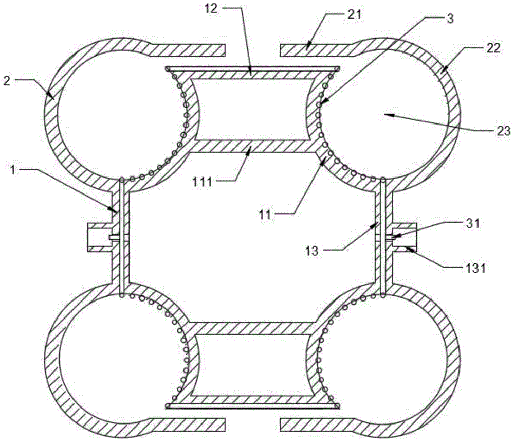 本实用新型涉及一种管卡,尤其是一种用于管材固定的电熔双U管卡。该用于管材固定的电熔双U管卡,包括塑料本体、设置于所述塑料本体上的多个开口式圆环、用于热熔连接的电阻丝,所述塑料本体包括热熔部、连接部、以及电极部,所述电阻丝分别经过所述热熔部、所述连接部的外表面以及所述电极部的中部,形成环形回路,所述电极部设有与所述电阻丝电连接的一对电极头。通过电阻丝将多个该管卡与同一导向的多个管道热熔连接,使管道在下沉过程中防止出现因弯曲过大而造成的下降受阻的情况。