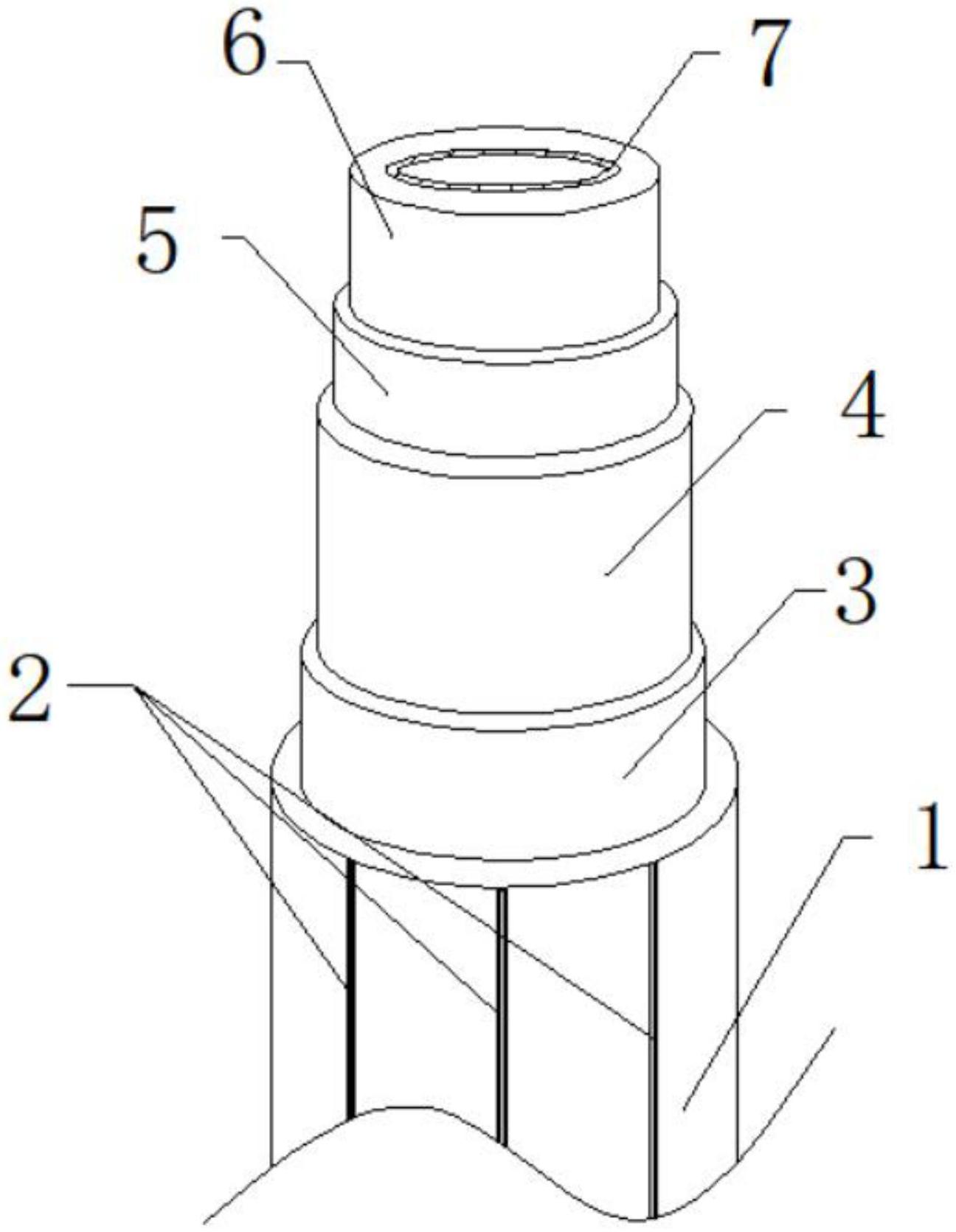 本实用新型提供抗菌型对接焊铝塑复合压力管,其特征在于包括塑料外层、塑料外层凸起件、外胶粘层、对接焊铝层、内胶粘层、抗菌塑料内层、抗菌层,在塑料外层的外侧壁一体成型有塑料外层凸起件,对本申请起到一定的支撑以及保护作用,使得塑料外层与地面处于非接触状态,同时能够防止塑料外层直接与地面接触,避免本申请在进行截切过程中,塑料外层与地面发生摩擦,使其产生磨损划伤的现象发生,进一步延长了本申请的使用寿命,进而提高了本申请的使用寿命;且该塑料外层凸起件为梯形结构,该梯形结构具有尖锐棱角,增加了抗摩擦性能,通过相邻的塑料外层凸起件即可对本申请实现支撑保护作用,极大提高了本申请的实用性能。