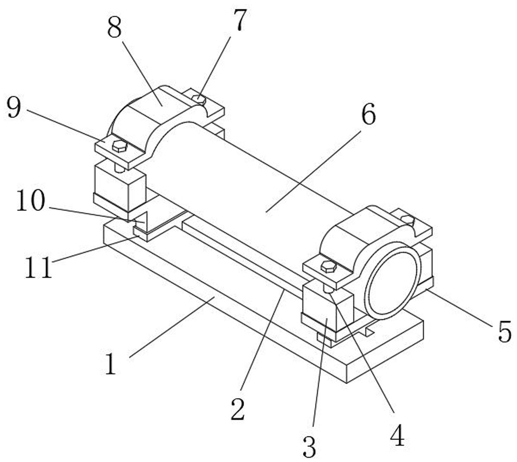 本实用新型公开了一种PCCP管材加工用辅助定位结构,涉及PCCP管加工技术领域。本实用新型包括底板,底板为矩形板体结构,底板上表面开设有滑槽,滑槽内部放置有滑动块,滑动块上表面焊接有下定位板,下定位板上表面包括有顶板,顶板一表面开设有下夹持槽,下夹持槽内部周侧面放置有PCCP管体。本装置通过设置带有内置电机的下定位板,在对PCCP管体进行加工时,可根据管材的长度推动两个滑动块的位置,使得PCCP管体两端放置在下夹持槽上,再使用连接螺钉将PCCP管体夹持固定在上定位板与下定位板之间,当需要翻转PCCP管体时,只需松开连接螺钉,启动内置电机带动转辊转动,此时转辊带动PCCP管体转动,可实现管材的轻松翻转,操作起来更加省力快捷。