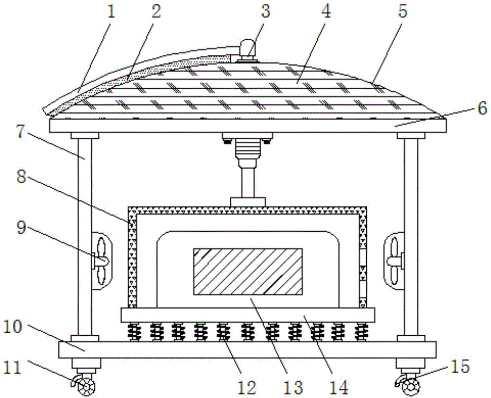 本实用新型公开了一种自适应式热泵,包括热泵本体和底板,所述底板上方设有安装板,所述安装板与底板之间通过减震弹簧连接,所述安装板表面设有安装槽,所述安装槽内壁两侧通过夹紧弹簧连接有夹紧板,所述支撑柱上端设有顶板,所述顶板上安装有挡雨遮阳罩,所述挡雨遮阳罩顶端设有安装座,所述安装座上端设有连接帽,所述连接帽一侧设有刷杆,所述挡雨遮阳罩表面铺设有太阳能电池板,所述顶板表面上端固定安装有电机,所述顶板底面固定安装有电动推杆,所述电动推杆底端设有防尘罩,所述底板底端设有移动轮,本实用新型,热泵安装稳定移动方便,具有很好的防雨、防晒、防尘及减震性能,使用寿命长,不易损坏。