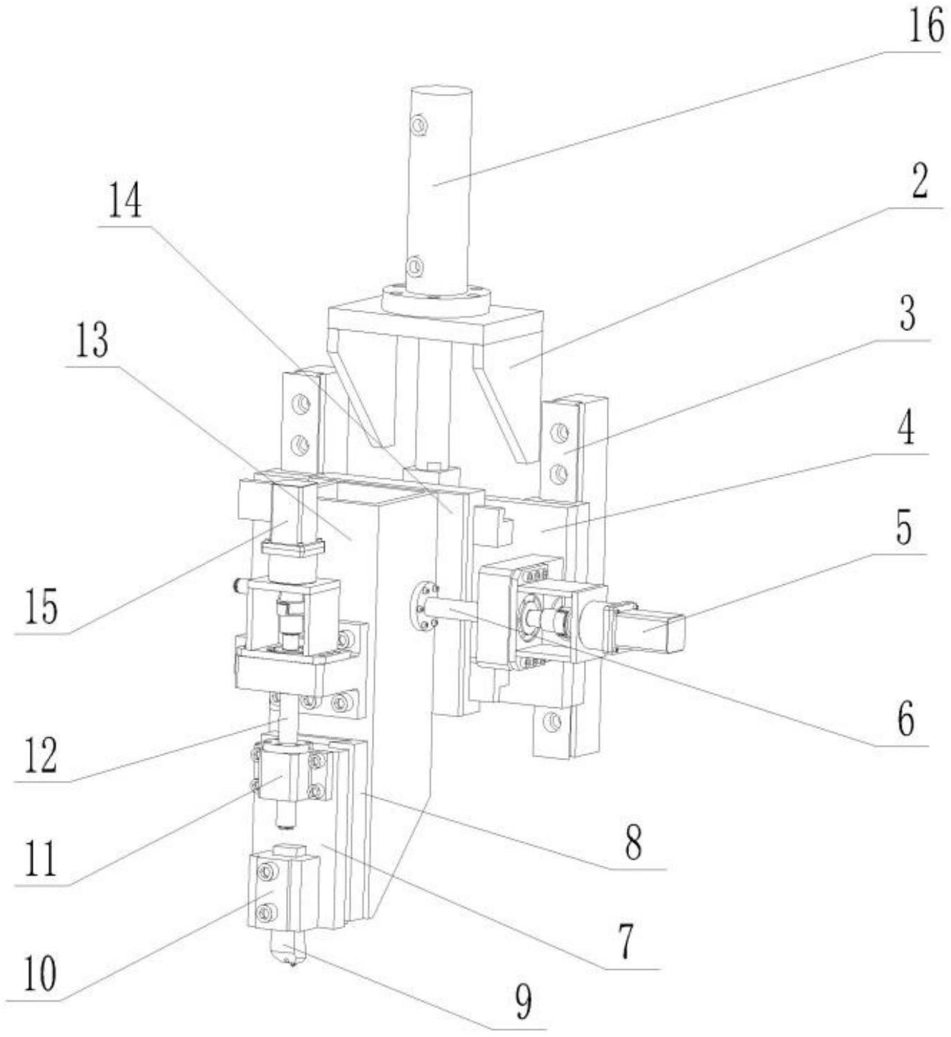 本实用新型公开了一种直缝埋弧焊管的高频预焊新增刮槽装置,该装置安装在钢管高频预焊出口处的轧机机架上,设有对钢管外坡口进行刮槽的刀杆,刀杆通过调节机构安装在钢管生产线轧机机架上,调节机构包括纵向升降机构、横向调节机构以及纵向调节机构,纵向升降机构包括纵向滑轨和纵向滑台,横向调节机构包括横向滑轨、与横向滑轨配合的横向滑台以及穿过横向滑台的横向调节丝杆;纵向调节机构包括纵向滑槽、与纵向滑槽配合的刀杆滑动座以及固定在刀杆滑动座上的刀杆安装座,刀杆滑动座上穿装有与纵向滑槽的轴线平行设置的纵向调节丝杆。本实用新型所述装置在保证钢管预焊缝强度的同时,提高焊接质量,解决了为满足焊接熔深而造成的焊缝余高问题。