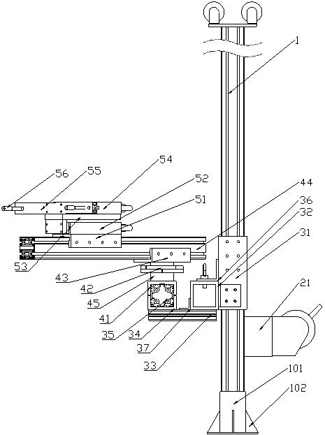 本实用新型公开了一种辅助放置射线探伤用标记袋的机械装置,包括两个完全相同的机械单元,机械单元包括竖向设置的立柱和固定在立柱上的升降机构和横移机构,横移机构的上方依次固定有转动机构和标记袋放置机构,立柱为竖向设置的铝合金型材,立柱的底端连接有用于固定立柱的底座,底座为内部空腔与立柱尺寸匹配的上下两端敞口的空心长方体。本机械装置能完成从小管径到大管径所用标记袋放置的适应性调整,比如针对从φ325‑φ2020钢管的管径调整,当然钢管管径也可以更小或更大;本机械装置使用中通过对横移机构和转动机构的调整,能实现标记袋放置后,焊缝位于标记袋宽度中心线上,标记袋的长度方向与焊缝长度方向一致。
