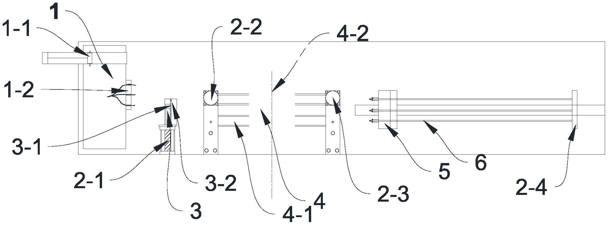 本实用新型涉及软管工业领域,公开了一种导电波纹软管的穿线设备,包括机架,还包括依次设置在机架上的送线装置、切割装置、定位装置及穿线针;穿线针设计在定位装置定位波纹软管的轴向延伸线上,第四气缸连接穿线针,并能够推动穿线针往复直线运动。一种导电波纹软管的穿线设备用于提高导电波纹软管的加工效率,降低成产成本,采用四个气缸带动自动化生产,将大幅度提高加工效率。