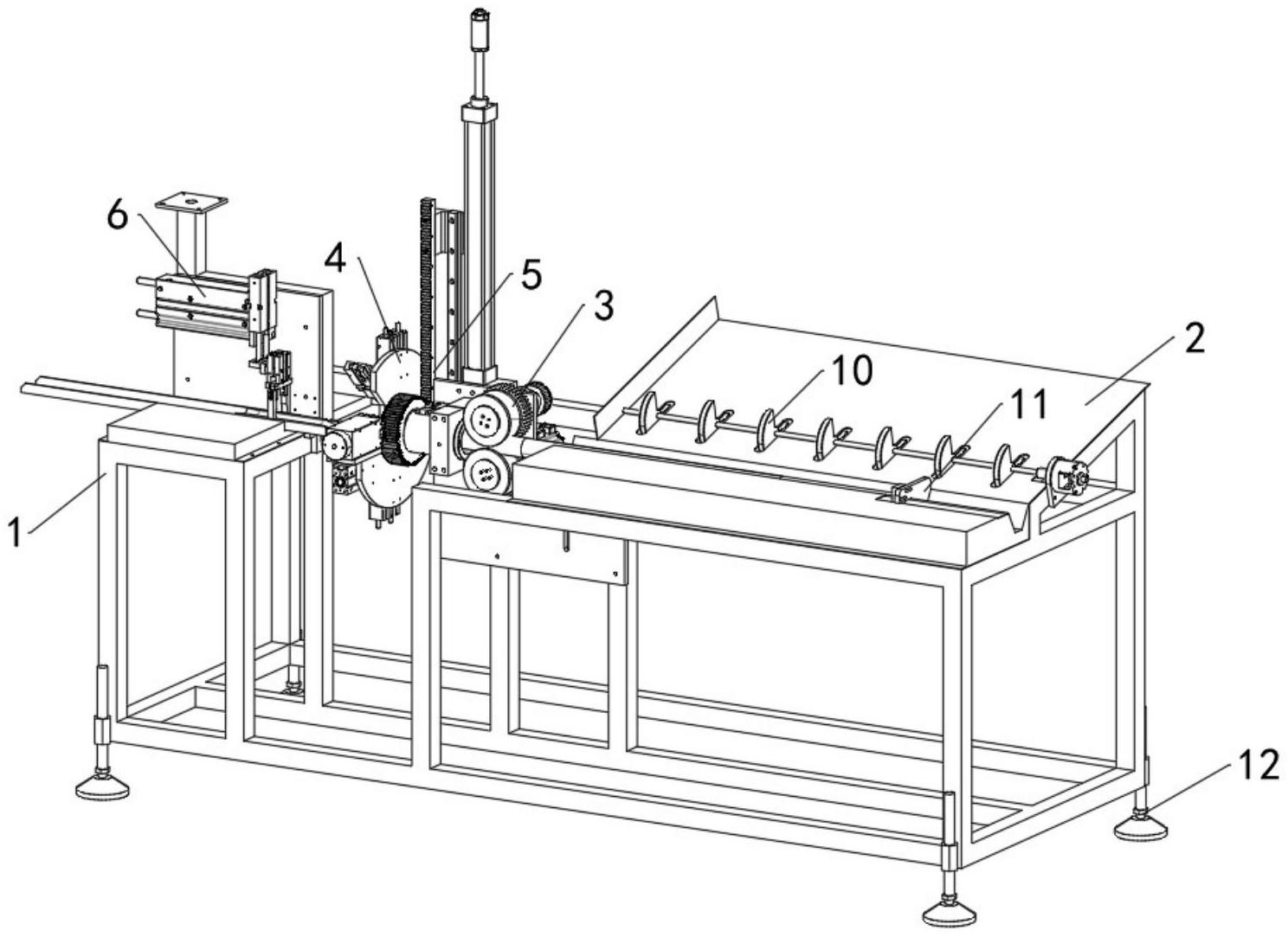 本实用新型公开了一种PVC伸缩软管用切割修边设备,包括支撑架,所述支撑架上设置有一用于传输管体的输料组件,所述支撑架上还设置有一承载环,所述管体设置在承载环内,所述支撑架上还设置有一驱使承载环转动的转动组件,所述支撑架上还设置有修剪组件,所述修剪组件位于承载环远离输料组件的一侧,所述支撑架上还设置有用于拉伸所述管体的拉伸组件。通过支撑架、输料组件、承载环、转动组件、修剪组件以及拉伸组件组件的配合,修剪组件与PVC伸缩软管抵接,通过转动组件驱使承载环转动的同时,传输组件驱使PVC伸缩软管滑动,便于对PVC伸缩软管进行修剪,通过拉伸组件对PVC伸缩软管进行拉伸,便于将PVC伸缩软管加工成所需要的形状,效率高。
