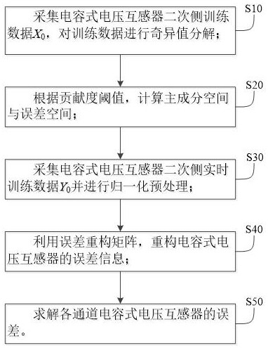 本发明适用于电气工程技术领域,涉及一种电压互感器误差在线监测与分析方法,包括:S10、采集电容式电压互感器二次侧训练数据X0,对训练数据进行奇异值分解;S20、根据贡献度阈值,计算主成分空间与误差空间;S30、采集电容式电压互感器二次侧实时训练数据Y0并进行归一化预处理;S40、利用误差重构矩阵,重构电容式电压互感器的误差信息;S50、求解各通道电容式电压互感器的误差。本发明流程简单、过程高效,通过训练数据,建立表征误差信息的误差空间与误差信息重构矩阵,并利用重构矩阵对各通道电压互感器的误差进行定量计算,监测效率与精度高。