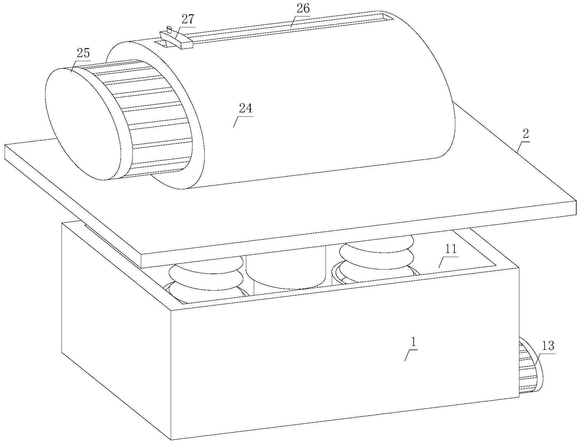 本实用新型公开了一种用于哑光耐候外墙漆的加工装置,包括助振盒和放置板,助振盒顶端设有放置板,板体底端设有按压套,第二压缩弹簧设置在连接孔内部,连接杆两侧均设有凸轮,凸轮一侧设有转杆,马达启动时带动转杆进行转动,连接杆随凸轮进行移动,使得设置在板体顶端的搅拌筒进行振动,对墙漆进行消泡,增加墙漆的流通性,搅拌筒顶端设有滑槽,刮漆机构设置在搅拌筒内部,螺纹固定杆将滑块固定在搅拌筒顶端,连接块贯穿滑槽一侧,半环刮板设置在搅拌筒内部,移动滑块,促使半环刮板对残留在搅拌筒内部底端的墙漆进行刮推,避免浪费。