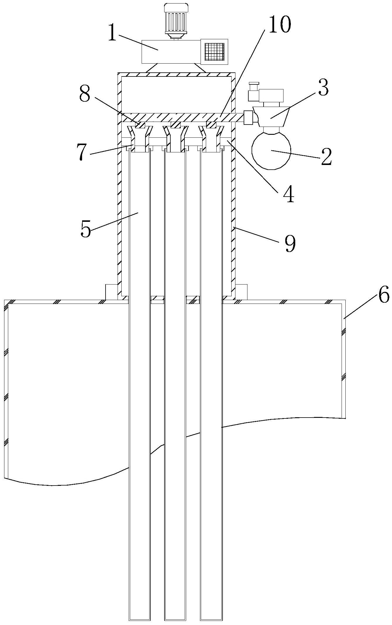 本实用新型涉及除尘器技术领域,且公开了一种新型仓顶除尘器,包括风机,所述风机的入风端固定连接有除尘器外壳,所述除尘器外壳的内壁固定连接有连接管,所述连接管的底部固定连接有清吹嘴,所述连接管的一侧固定连接有脉冲阀,所述脉冲阀的输入口活动连接有储气罐,所述除尘器外壳的内壁固定连接有孔板,所述孔板的一侧开设有通孔,所述通孔的内壁活动连接有导流嘴。该新型仓顶除尘器包括风机,达到了滤材更换费用低的目的,解决了一般新型仓顶除尘器滤材更换费用高的问题,可靠性高,维修频率低,维修工作量小,维修费用低,新型除尘器滤材更换费用低,清灰效果好,滤材使用寿命长,环保排放可靠性更高,大大降低了维修工作量和维护费用。