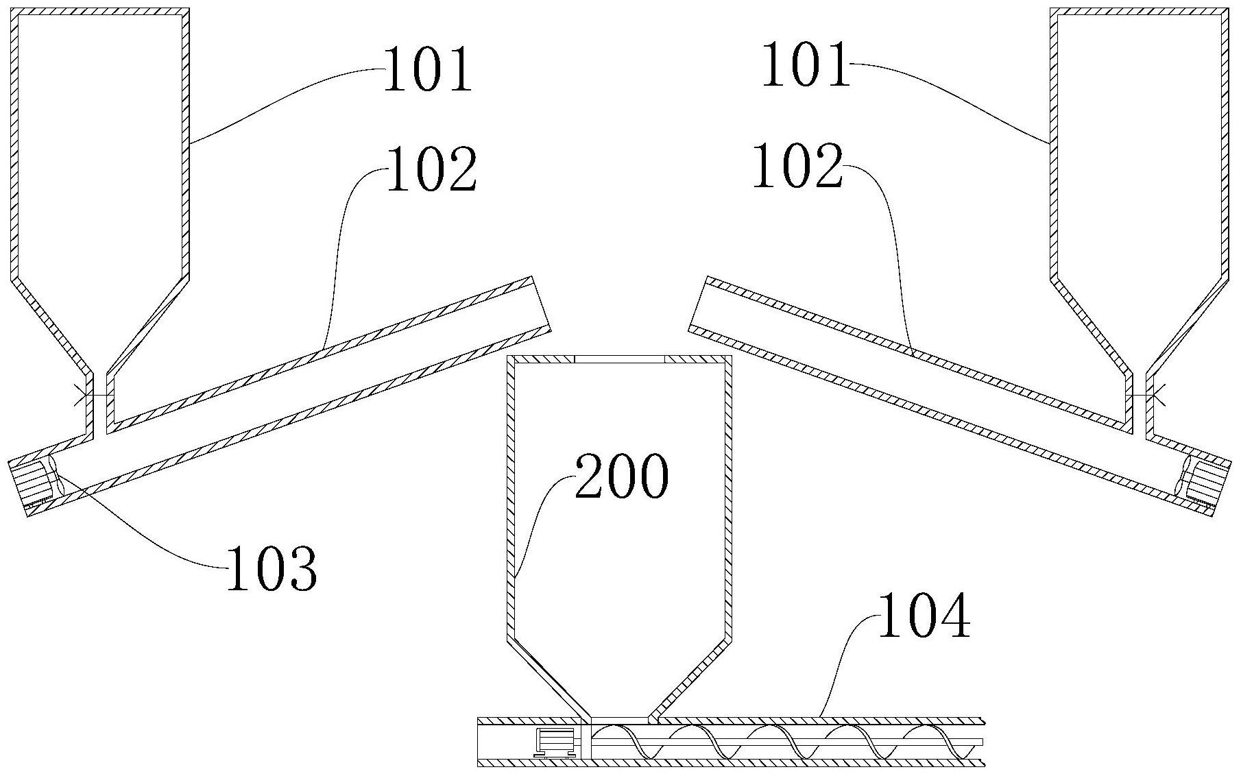 本发明提供了一种干粉混料输送系统,属于建筑建材领域,其包括螺旋搅拌机和多个储仓,储仓包括储料罐和输送管,输送管倾斜设置,储料罐的出口连通输送管,螺旋搅拌机的入口处设置有进料装置,进料装置包括壳体、搅辊和磁性件,壳体的上下两端分别设置进料口和出料口,搅辊设置在壳体的中部,搅辊上端设置锥形帽,下端连接电机,磁性件设置在壳体的内壁,锥形帽的帽沿伸出搅辊的外壁,磁性件与搅辊之间形成供干粉通过的通道,输送管的下端设置有风机,上端位于进料口处,出料口连通螺旋搅拌机。本发明提供的干粉混料输送系统既能精确控制干粉的加入量,避免浪费,同时又能达到使干粉混合均匀并除去其中的金属杂质的目的,工作效率高,利于推广。