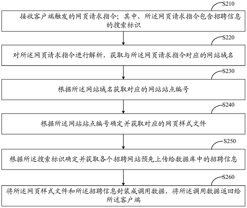 本发明公开了一种基于域名共享人才资源数据的方法,涉及互联网技术领域,该方法包括:接收客户端触发的网页请求指令;对网页请求指令进行解析,获取与网页请求指令对应的网站域名以查询对应的网站站点编号;并确定并获取网页样式文件和招聘信息;将网页样式文件和招聘信息封装成调用数据,将调用数据返回给客户端。通过将各个网站的招聘信息存储在数据库中,用户登入任一网站都可获取其他网站的招聘信息,避免各个招聘网站独立开发造成的信息对外封闭和成本高昂,从而提高招聘的成功率和效率。此外,通过网站域名和网站站点编号,可以快速准确地定位到所需数据,从而高效地为各个网站用户提供服务,提升用户的体验。