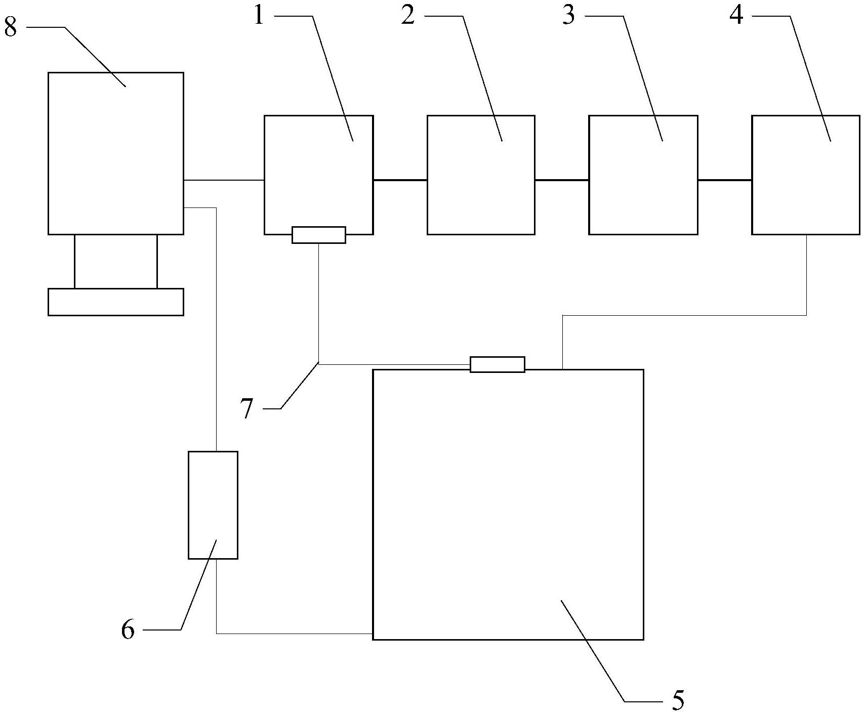 本实用新型公开了一种压机油箱冷却系统,包括有中转油箱、循环泵、过滤装置、冷却装置、储油箱及输油泵,通过设置过滤装置对液压油进行过滤,减少杂质,降低压机的能耗和提高工作效率;通过设置冷却装置对流经的液压油进行降温,可保证液压油的粘性,也降低了液压油的变质速度,有利于整个液压系统的运转;在中转油箱与储油箱之间设置有补偿油路装置,使得储油箱内的液面水平保持稳定,满足压机的作业需求;本实用新型的结构简单,设备耐用,能够降低液压油的温度,同时能够过滤杂质,保障了压机的正常和稳定运行。