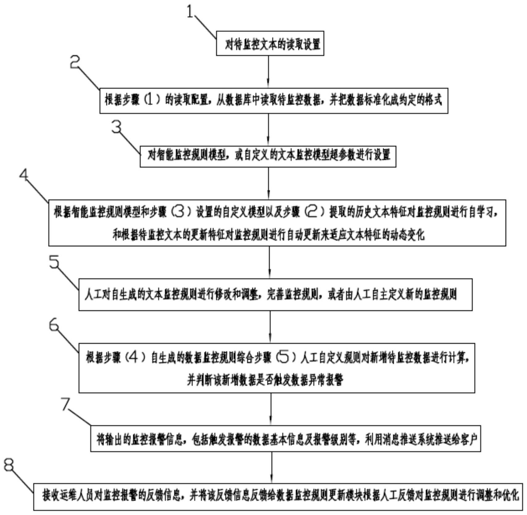 本发明公开了一种文本类数据质量监控方法,其包括如下步骤:1)对待监控文本的读取设置;2)读取待监控文本,并约定标准格式;3)设置监控模型超参数;4)对监控规则进行自学习,和自动更新监控规则;5)人工对自生成的文本监控规则进行修改和调整;6)计算,并判断该新增数据是否触发数据异常报警;7)推送监控报警信息;8)接收反馈信息;其还公开了一种文本类数据质量监控系统;本发明提供的方法提高数据质量监控的质量、效率及覆盖面;系统支持人工设定监控规则,还能利用机器学习技术从文本中提取特征,利用待监控历史文本数据进行建模,人工可以接受自学习的默认规则也可以修改参数、添加手动规则,人机结合提供规则的可靠性。