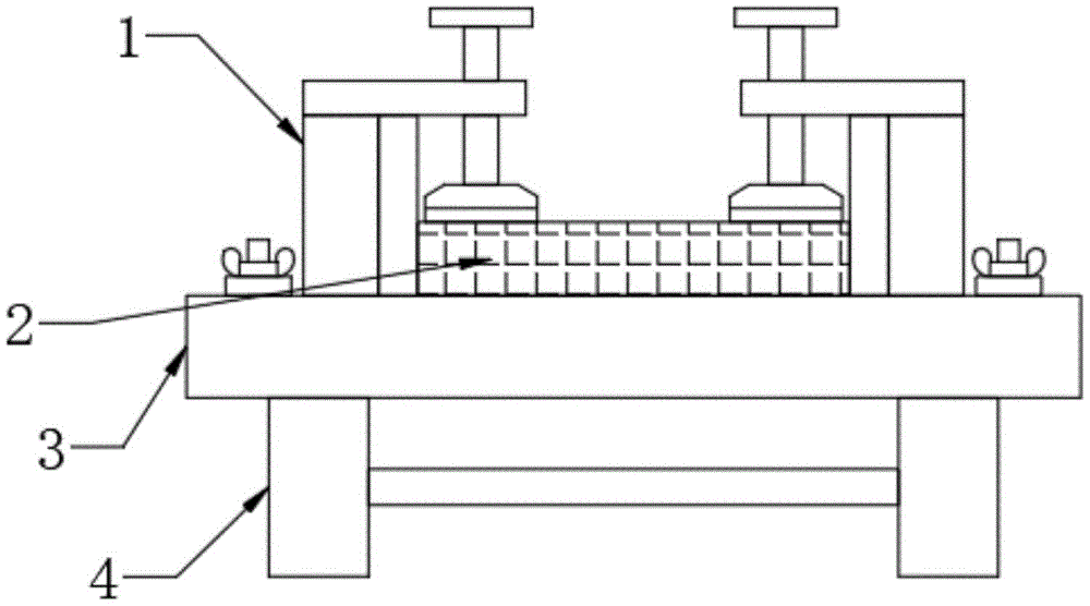本实用新型提供一种瓷砖切割机用陶瓷砖固定装置,包括陶瓷砖主体、工作台、固定支架、调节螺杆、横梁板、固定挡板、橡胶防护垫、夹紧板、缓冲垫、滑槽、滑块以及滑板,工作台上端面放置有陶瓷砖主体,工作台下侧安装有固定支架,工作台内部开设有滑槽,工作台上侧设置有固定挡板,固定挡板右端面固定有橡胶防护垫,固定挡板下端面固定有滑块,滑块下端面固定有滑板,固定挡板上端面固定有横梁板,横梁板内部贯穿安装有调节螺杆,调节螺杆下端面安装有夹紧板,夹紧板下端面固定有缓冲板,该设计解决了原有瓷砖切割机需要手动固定且固定不够稳固的问题,本实用新型结构合理,便于组合安装,固定效果好。