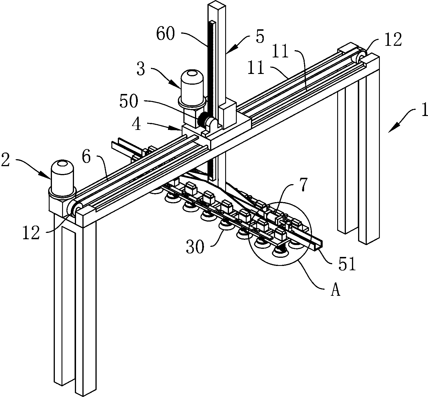 本实用新型涉及一种应用于瓷砖生产线上的吸砖分间隔装置,其特点在于包括龙门架、第一驱动电机、第二驱动电机、横向移动架、竖向移动架、齿带、两个驱动气缸、固定块、若干滑动块、若干连动条、若干限位螺钉、若干真空吸盘,上述构件通过合理的组装结构组装在一起,以通过第一驱动电机驱动横向移动架,通过第二驱动气缸驱动竖向移动架做竖向运动,以带动竖向移动架上的真空吸盘做竖向往复移动,在真空吸盘与对应的固定块、真空吸盘与对应的滑动块分别设有弹簧。本实用新型具有结构简单、自动化程度高、生产效率高、使用维护成本低、故障率低等优点。