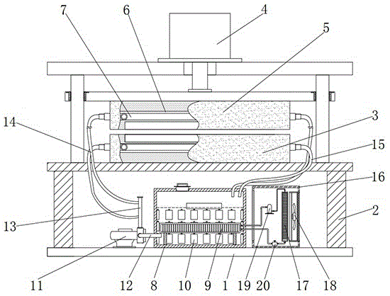 本实用新型属于PC板生产技术领域,尤其为一种PC耐力板生产用快速冷却装置,包括底板,所述底板的顶部固定安装有支撑台,所述支撑台的顶部固定安装有下模具,所述支撑台的顶部固定安装有液压升降机组,所述下模具的上方固定安装有上模具,且上模具与液压升降机组固定连接,所述上模具和下模具内均开设有制冷腔,两个制冷腔内固定安装有盘管,所述盘管的进水口与排水口均延伸至制冷腔外,所述底板的顶部固定安装有水箱、水泵和防护箱。本实用新型实用性高,上模具和下模具均可被制冷,对PC板材的冷却定型速度快,并且具有相变蓄冷功能,短暂停机后可快速的对上模具及下模具进行预冷,提高生产效率。