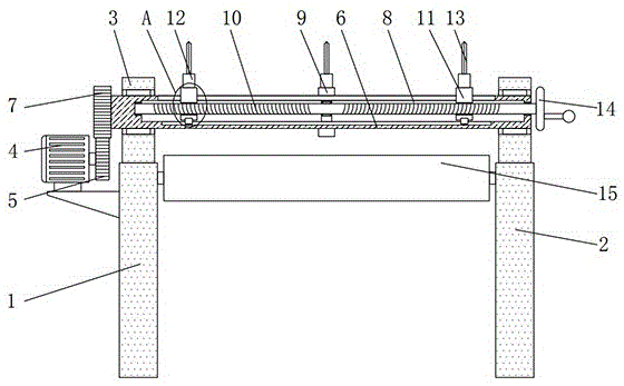 本实用新型属于太阳能板生产技术领域,尤其为一种太阳板生产用切割设备,包括第一立板和第二立板,所述第一立板和第二立板的顶部均固定安装有固定座,所述第一立板远离第二立板的一侧设有电机,所述电机的输出轴上固定套设有第一齿轮,两个固定座相互靠近的一侧转动安装有同一个转动柱,所述转动柱的一端延伸至固定座外并固定套设有第二齿轮,所述第一齿轮与第二齿轮相啮合,所述转动柱上固定套设有第一连接块。本实用新型设计合理,通过设置的丝杆、第一连接块和第二连接块便能对刀片之间的位置进行调整,调整速度得到提高,操作简单,减少了对生产线的影响,一定程度上提高了生产效率。