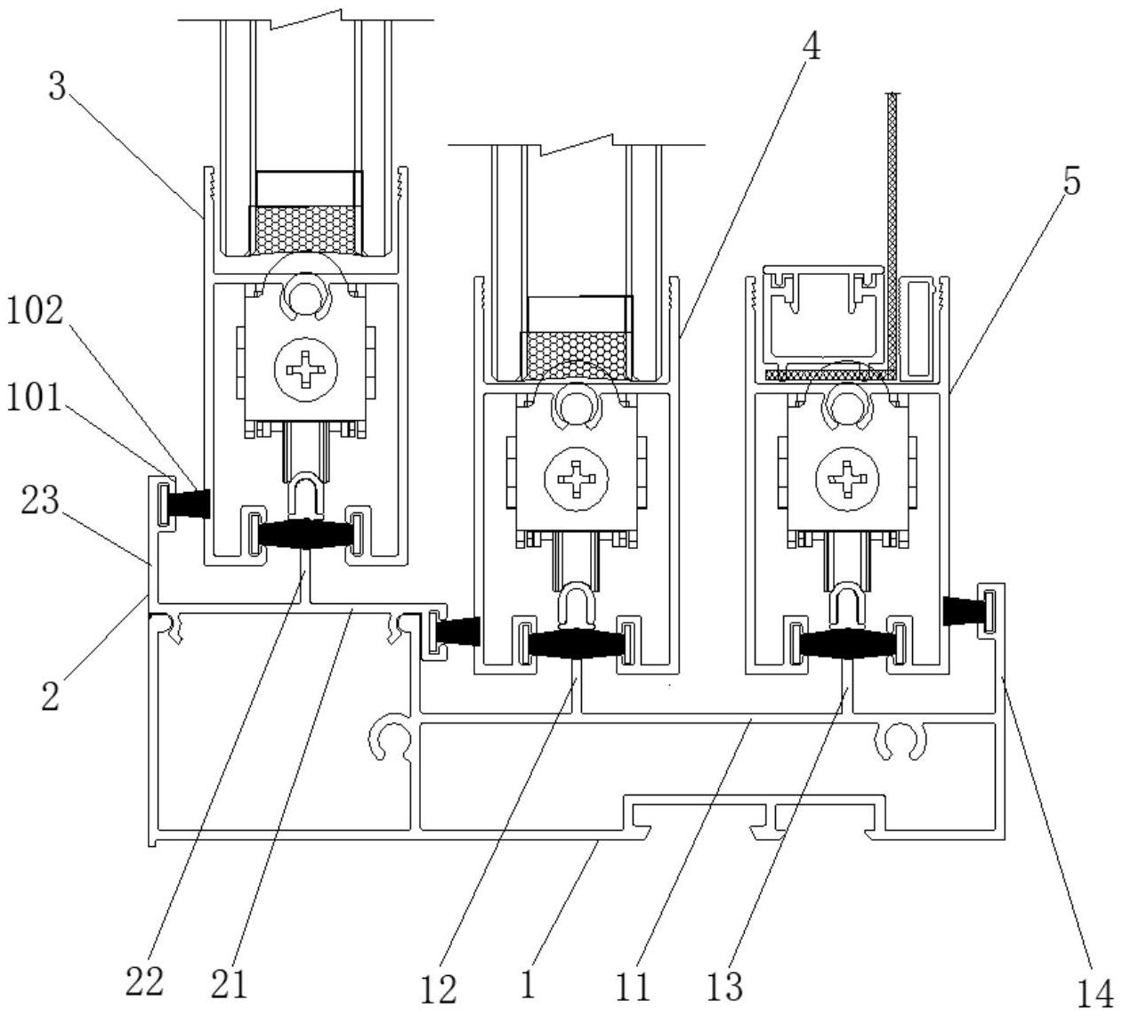 本实用新型公开了一种推拉窗下滑结构,包括下滑型材和内分体,所述下滑型材的右侧设置有第一支撑梁,所述内分体卡接在下滑型材的顶部左侧,该内分体上设置有第二支撑梁,所述第二支撑梁的高度高于第一支撑梁的高度,所述第一支撑梁上设置有第一轨道和第二轨道,所述第二支撑梁上设置有第三轨道,将室内的第三轨道与室外轨道采用分体式,解决了高低轨道所有门页需从室外进行安装的难题,所有门页均从室内进行安装,既保证了推拉窗的排水性能,又保证产品的安装方便性能;通过在第二轨道侧面设置外档边,室外门页从室外无法取出,保证门窗的安全性;同时室内室外、光企下方均带有毛条,达到多重密封,气密性效果更好。