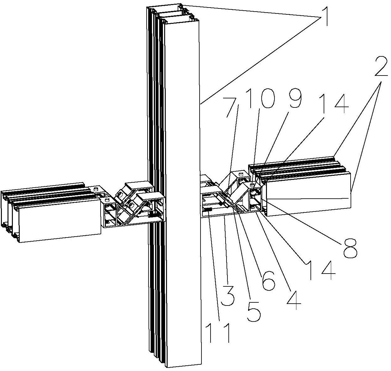 本实用新型公开了一种用于隔断门窗或隔断墙的型材连接结构,包括柱体框及其两侧的分隔框,它还包括两组连接组件,它们分别插入两条分隔框的内腔,每组连接组件包括A连接框和B连接框,B连接框的一侧,为与A连接框的A斜面对应的B斜面,A斜面与B斜面之间以螺丝固接,B连接框的另一侧为矩形框,矩形框的上下底,都插有底部连有弹簧的定位柱;以至少两根螺杆,穿过两个A连接框上的直边一侧及柱体框,将两个A连接框均与柱体框之间固接。上述结构由于设有连接组件,柱体框与分隔框之间的连接,不仅通过定位柱弹伸出定位孔外,起到限位式连接,而且更重要的是,还通过螺杆及螺丝的拉紧作用,实现拉紧式连接,连接十分紧固,不会产生松动,外形更加美观。