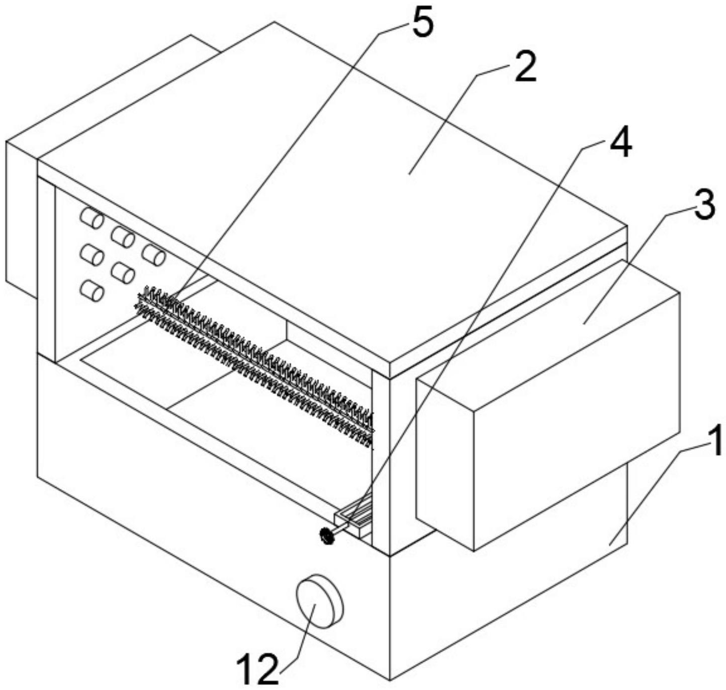 本实用新型涉及喷涂挂具技术领域,具体为一种立式喷涂挂具涂层的脱涂装置,包括机座,机座上固定连接有支板,支板左右两端外壁上均固定连接有水箱,右侧机座顶端上设有移动组件,移动组件上设有刷除组件;将溶解液体倒进机座内的矩形槽一内,挂具放入有溶解液体的矩形槽一后进行涂层与挂具的分离溶解,分解过后的挂具会经过刷除组件对其清除表面残留涂层,移动组件可以调节刷除组件和挂具之间的间距,保证刷除组件能对挂具表面涂层进行清除,支板两侧的水箱会提供水源对挂具进行清洗。