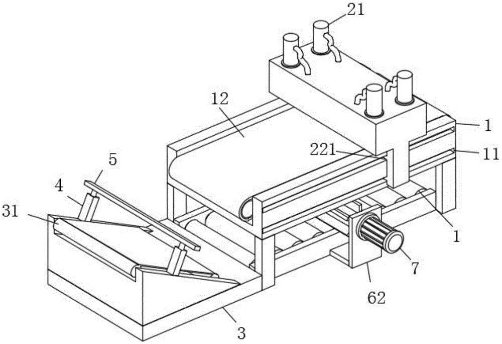 本实用新型公开了一种板材加工用粉尘清除机,包括机架与吸尘装置,机架的上表面与吸尘装置滑动连接,机架的内部通过转轴转动设有第一传送带,吸尘装置位于第一传送带的上表面;板材灰尘较多的一侧在清理干净后通过第一传送带的运输,进入第二传送带上,并通过清洁杆对板材的另一侧灰尘进行清除,达到清灰的目的;活动板通过对称设置滑块滑动设置在滑轨的内部,使得活动板上方的活动储架可在机架的上表面进行活动,便于调整位置来进行吸尘步骤;当缓冲挡杆受到板材的压力向下压时,通过弹簧的缓冲力使得板材能稳定的下滑,防止速度过快,造成板材表面受损。
