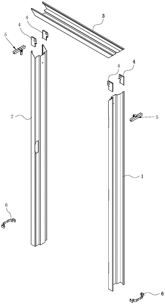 本实用新型属于门技术领域,具体涉及一种拼接门框。针对现有拼接式门框结构不尽合理的不足,本实用新型采用如下技术方案:一种拼接门框,所述拼接门框包括:直档,所述直档具有竖嵌槽部和垂直于竖嵌槽部的竖开孔部,所述竖嵌槽部上端具有第一倾斜面;头框,所述头框具有横嵌槽部和垂直于横嵌槽部的横连接部,所述头框两端具有第二倾斜面;连接导向片;调整装置,所述调整装置包括可转动的安装于直档的竖开孔部上的左右设置的调整螺钉和与调整螺钉螺纹连接的顶紧架,所述调整螺钉上具有可抵触直档的竖开孔部的抵触部。本实用新型的拼接门框的有益效果是:通过连接导向片连接直档和头框,通过调整装置使直档和头框紧密连接,安装较为容易。
