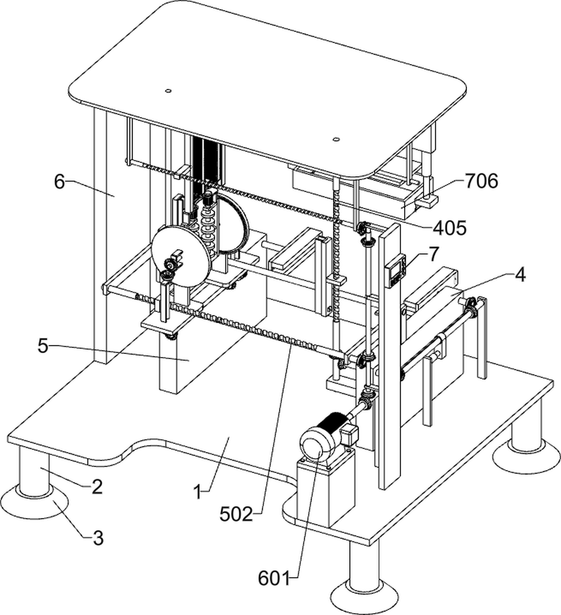 本发明涉及一种家具领域,尤其涉及一种带有牛皮纸的防火门板基板网格槽开设清理设备。本发明的技术问题:提供一种带有牛皮纸的防火门板基板网格槽开设清理设备。本发明的技术实施方案是:一种带有牛皮纸的防火门板基板网格槽开设清理设备,包括有第一支撑架、第二支撑架、第三支撑架、控制器、开槽组件、清理组件和放板组件;放板组件与第三支撑架进行固接。本发明使用时实现了通过打磨的方式同时在基板两侧开设多条凹槽,大大提升了开槽效率同时避免导致基板破损,然后对凹槽进行二次清理,清理掉其中因打磨产生的碎屑灰尘,自动将金属网格板准确放入基板的凹槽中,避免人工操作出现受伤的情况。