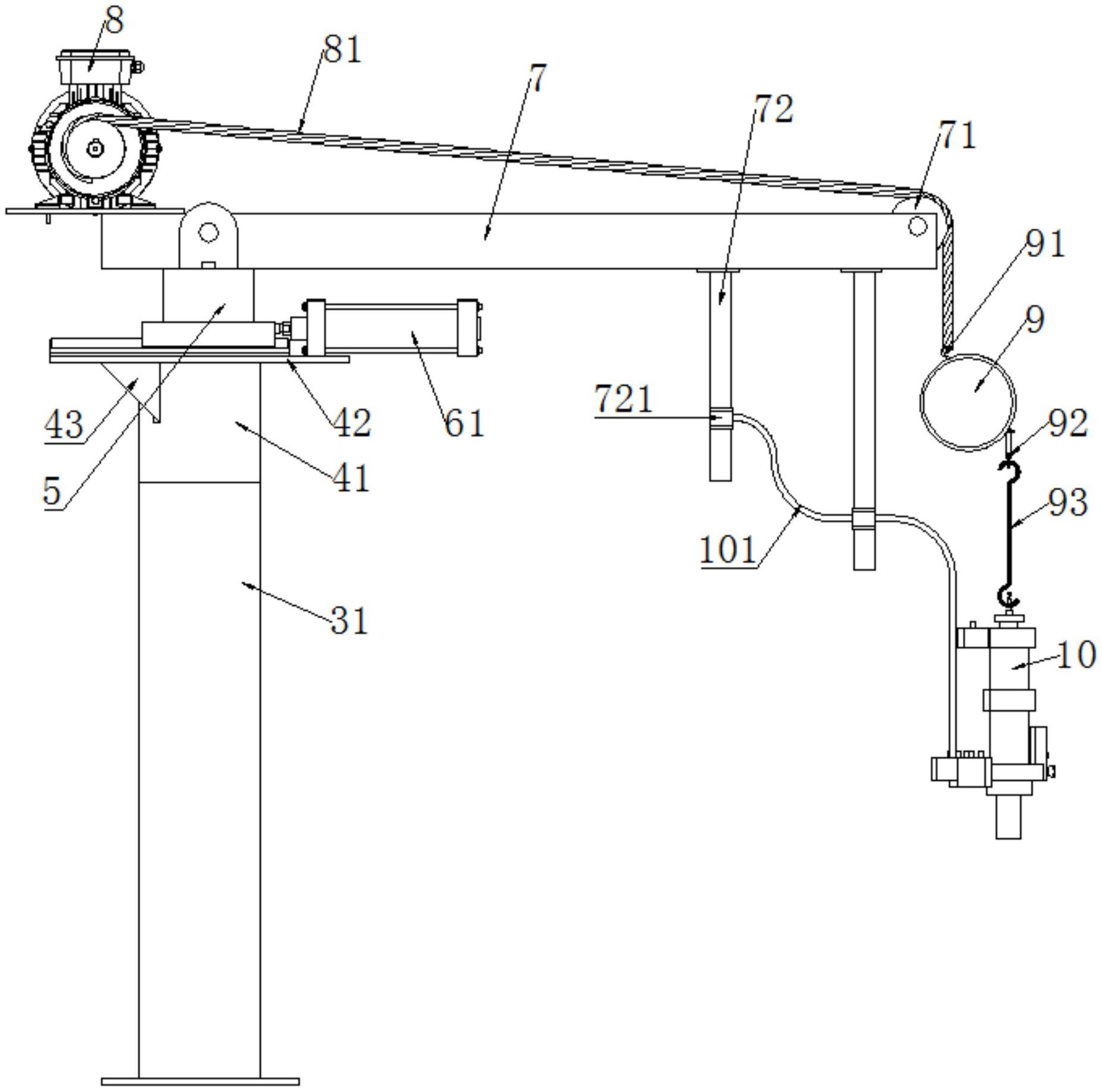 本实用新型公开了一种太阳能水箱发泡用人工辅助注料装置,包括发泡枪头、立架、转动架、滑台、复位机构、桁架、卷扬机、平衡器,立架的上端转动连接有转动架,转动架的上端设有滑台,滑台沿着以转动架为圆心的径向滑动,转动架上设有用于驱动滑台径向复位的复位机构,滑台的上端设有桁架,桁架在靠近滑台的一端设有卷扬机,桁架在远离滑台的一端设有平衡器,卷扬机通过吊绳与平衡器连接,平衡器与发泡枪头连接。本实用新型不仅使注料操作方便灵活,还方便更换不同产品型号的水箱,有利于提高注料效率和水箱的生产效率。