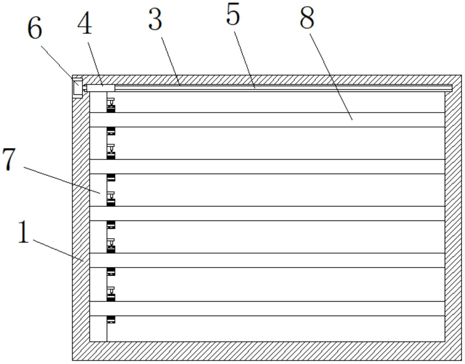 本实用新型公开了一种卡扣式医用门通风百叶窗,滑槽内滑动连接有滑块,滑块螺纹连接有螺纹杆,螺纹杆的两侧均通过轴承转动连接于滑槽内侧壁,滑块的底部固定有推杆,推杆的外侧均匀固定有转轴座,转轴座通过轴承转动连接有转杆,转杆固定有弹簧柱,弹簧柱的端部铰接有套接于叶片外侧的套圈,套圈内腔上下两侧均通过第一弹簧连接有活动板,活动板的外侧设有毛刷。该百叶窗通过电机驱动螺纹杆正反旋转,带动滑块在滑槽内往复移动,由推杆带动套圈移动,使得毛刷能够对叶片外侧进行清扫,从而提高百叶窗的清洁便捷度;通过第一弹簧推动活动板带动活动板紧贴在叶片上,从而提高叶片的清洁效果。