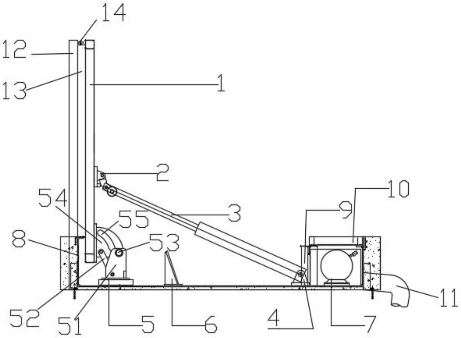 本实用新型公开了一种液压翻板式挡水门,包括挡水门板、门框、密封条、限位块、液压前轮座、液压推杆、液压底座、旋转机构、上升轮座、液压动力单元和容纳框架,容纳框架固定在地下,门框竖直固定在容纳框架上,密封条固定在门框的两侧,限位块固定在门框的顶端两侧,旋转机构、上升轮座和液压底座间隔固定在容纳框架中,液压动力单元封装在容纳框架中,液压推杆的固定端转动安装在液压底座上,液压推杆的伸缩端安装在液压前轮座上,挡水门板固定在液压前轮座和旋转机构上,液压推杆与液压动力单元连通。该液压翻板式挡水门能够快速响应,及时挡水,方便安装,容易收纳,实施效率高。