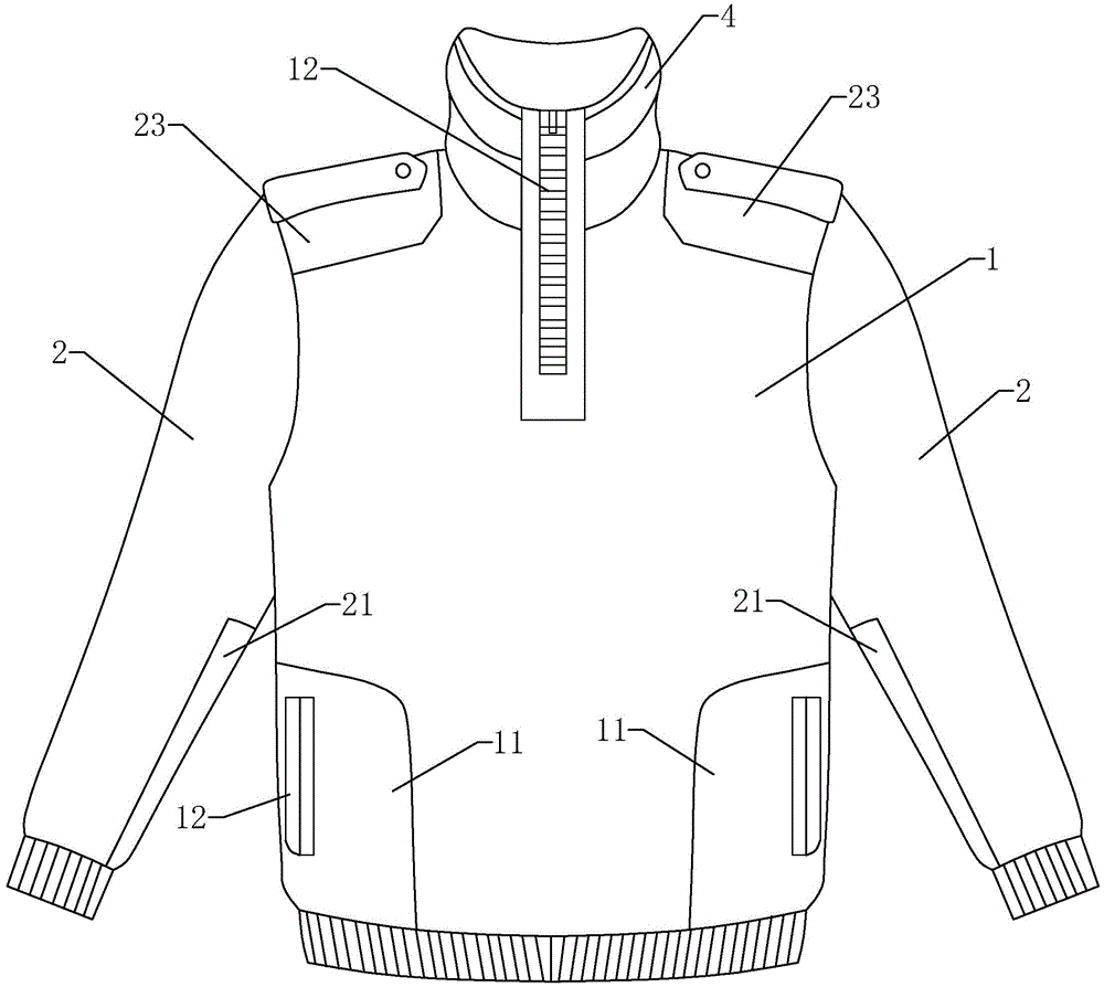本实用新型公开了一种具有安全防护功能的特勤服,应用在警服领域,解决了现有警服不够安全防护性能低的技术问题,其技术方案要点是包括由导电纤维制成的主体部、位于主体部两边的长袖,位于主体部上端的领口,所述主体部上位于领口的两边均设有肩护垫,所述长袖上靠近长袖的袖口位置设有第一护垫;所述长袖上靠近肩护垫的一端还设有第二护垫,所述肩护垫、第一护垫、第二护垫内侧设有硬材质的衬板,所述衬板包括若干板条,相邻所述板条之间分别设有相互配合的条形的凸棱和条形的凹槽,具有的技术效果是通过护垫的设置,很好的保护工作人员的肘部、肩膀、手臂等部位。