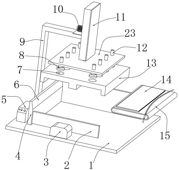 本实用新型公开了一种可自动对齐的门板拼板装置,包括操作台,所述操作台上放置有控制器,所述操作台上固定安装有支架,所述支架远离所述操作台的一端固定安装有电机和安装盒,所述电机的输出轴延伸至所述安装盒中,所述安装盒中设置有两个直排齿和一个主动齿轮,所述直排齿远离所述主动齿轮的一侧外壁均固定安装有导向块,所述导向块的顶部外壁开设有圆孔,所述圆孔中均插接有导向杆,其中一所述直排齿的底部外壁固定安装有第一连接柱。本实用新型公开的可自动对齐的门板拼板装置通过同一个电机的不同动作配合升降组件实现对板材表面喷胶与压合的目的,具有装置结构简单,易于安装的技术效果。
